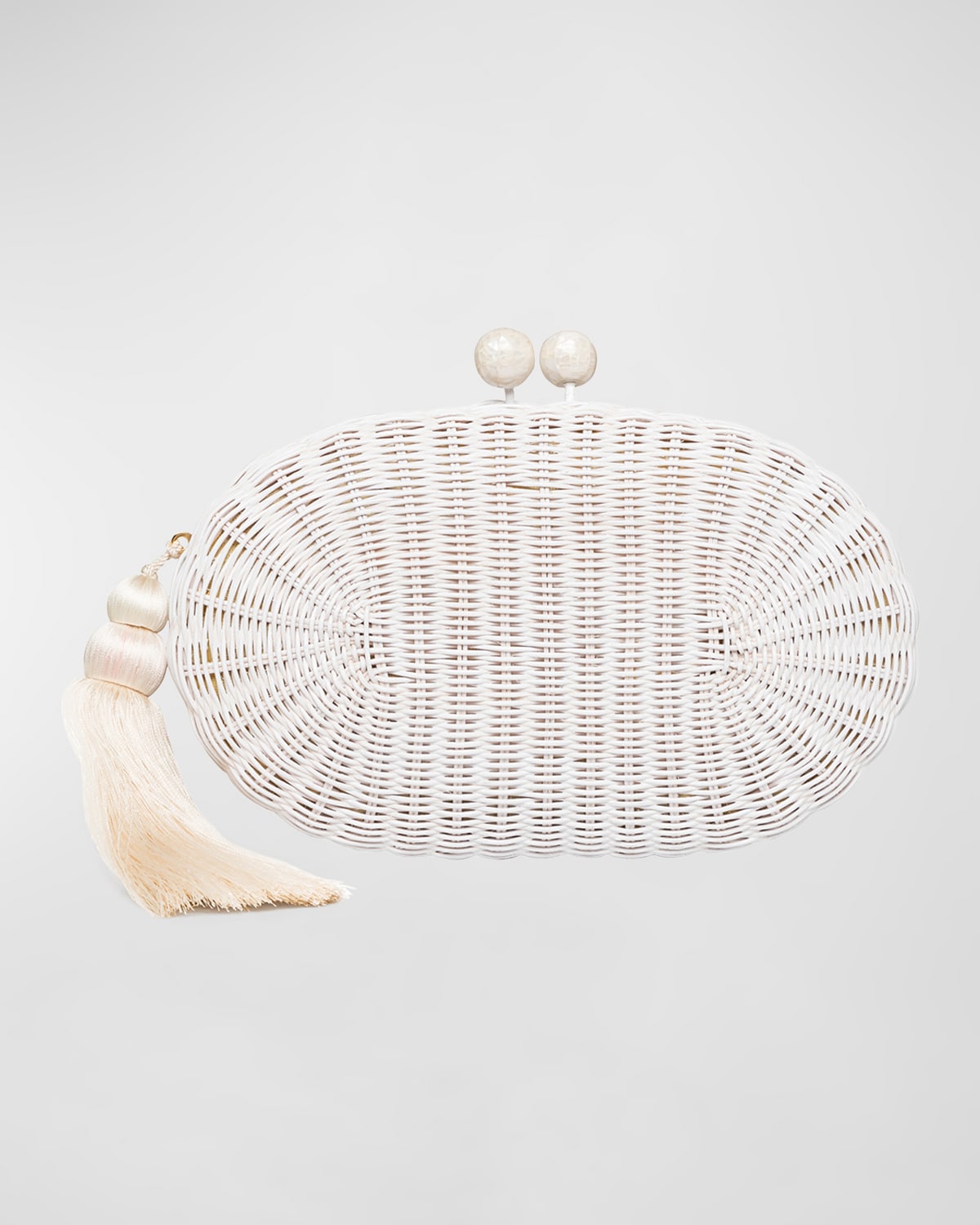 Rafe "Joanna" clutch bag in handwoven palm straw Detachable chain shoulder strap, 23" drop/ 0.3"W Can be worn as a clutch or shoulder bag Structured top with kisslock/magnetic closure Exterior, tassel charm Interior, one slip pocket Keep in dust bag after wear Lining: Polyester Approx. 7"H x 10"W x 3"D Item Weight (Lbs.): 1.0 Imported