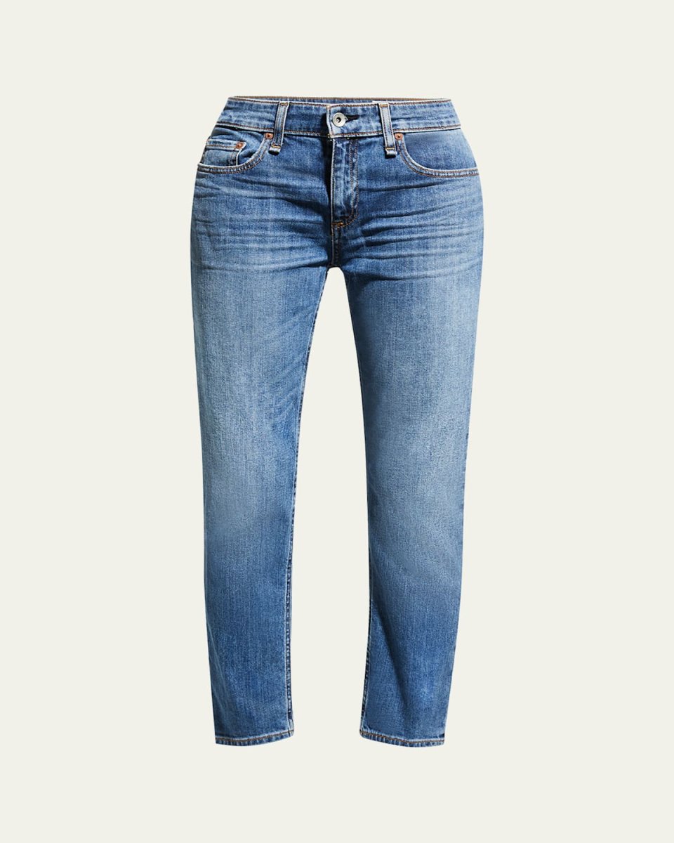 Rag amp; Bone "Dre" jeans in mediumwash denim. Approx. 8.5" rise; 27" inseam; 12.5" leg opening. Low rise. Fivepocket style. Slim, straight legs. Cropped above ankles. Button/zip fly; belt loops. Cotton. Machine wash. Made in Mexico.