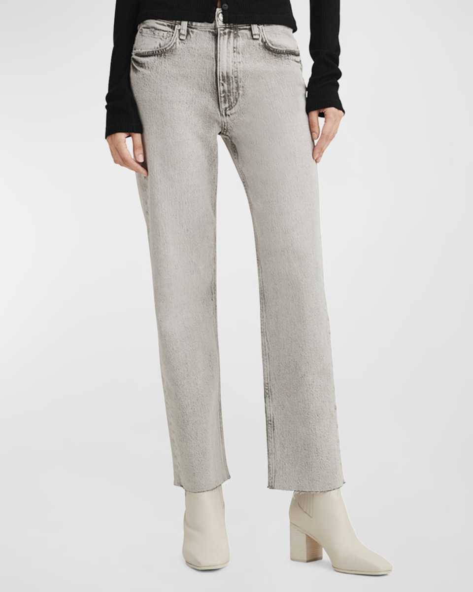 Rag amp; Bone "Harlow" straightleg jeans featuring a raw hem in grey denim Approx. 11" rise; 28.5" inseam Midrise; sits high on hip Fivepocket style Relaxed fit Cropped length Button/zip fly; belt loops Cotton/elastane Machine wash Imported