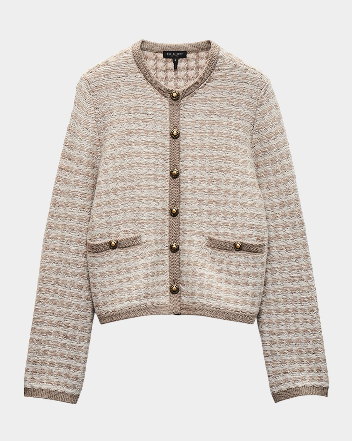 The "Robyn" lady cardigan by Rag amp; Bone is crafted from striped tweed and finished with vintageinspired buttons for a chic and sophisticated look. Round neckline Long sleeves Patch pockets Classic fit Hem sits at the hip Buttonfront Wool Dry clean Imported