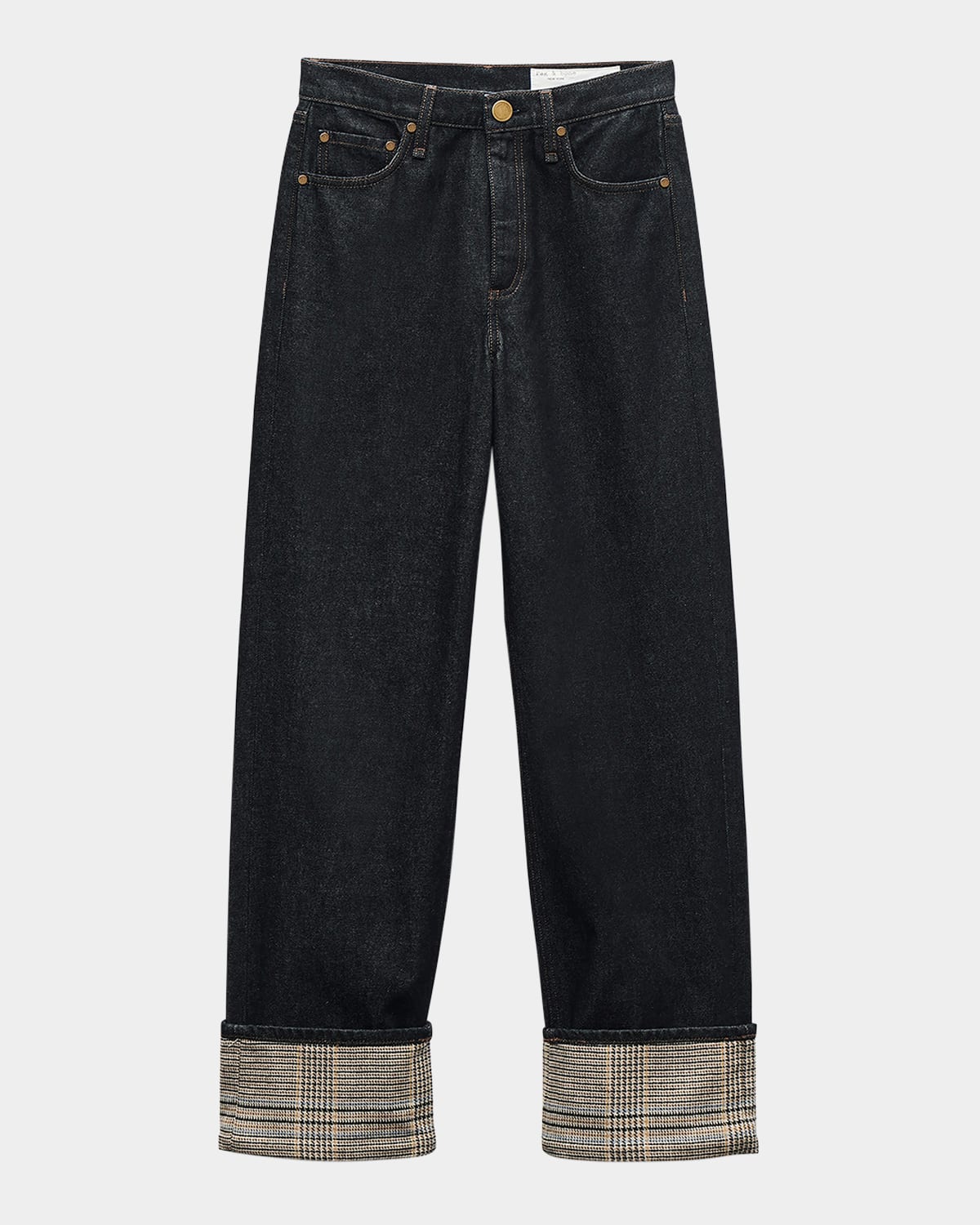 Crafted in lightweight, rigid denim, the "Shea" jeans by Rag amp; Bone boast a 4"cuffed hem with Italianmilled heritage wool plaid trim. Approx. 11.75" rise; 30" inseam High rise Fivepocket style Relaxed, straight legs Ankle length Button/zip fly; belt loops Cotton/viscose/Tencel® lyocell Dry clean only Imported