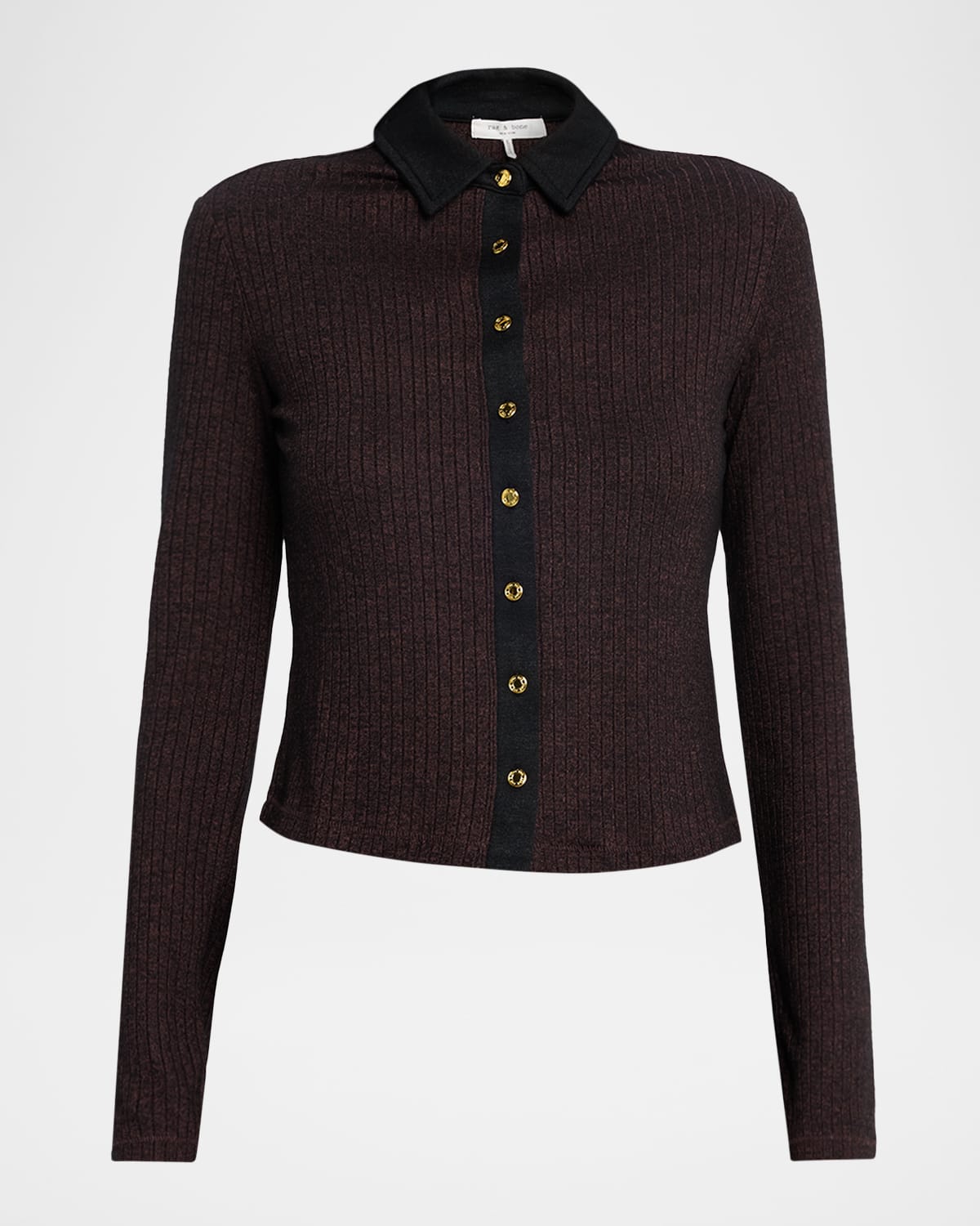 Crafted from a ribbed knit with contrasting trim, this Rag amp; Bone top features goldtone buttons for a polished finish. Spread collar Long sleeves Slim fit Hem sits at the hip Buttonfront Promodal® rayon/polyester/spandex Machine wash cold Imported