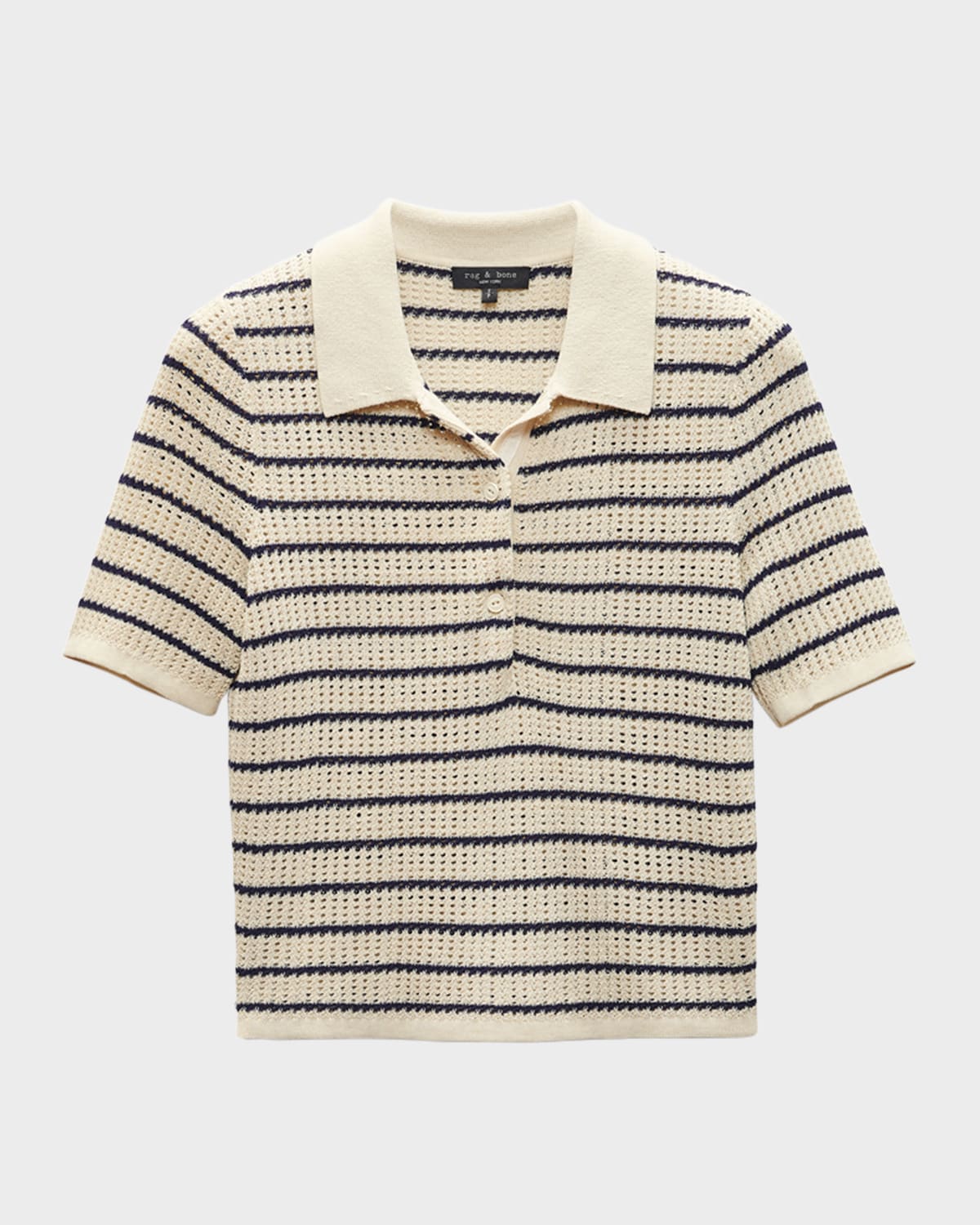 Rag amp; Bone "Viola" openknit polo top featuring a stripe motif Point collar; button placket Short sleeves Easy fit Hem sits at the hip Cotton/nylon/polyamide Unlined Dry clean Imported