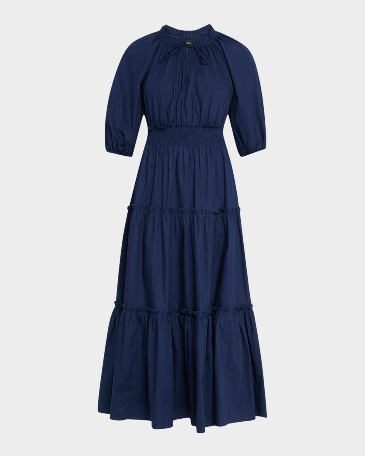 Rails "Caterine" tiered maxi dress crafted from structured, breathable cotton poplin in a cinched silhouette with ruffle details Approx. 53.5"L from shoulder to hem V neckline with selfties Elbowlength balloon sleeves; elastic cuffs Smocked waistband Full length Slipover style Cotton Unlined Hand wash or dry clean Imported