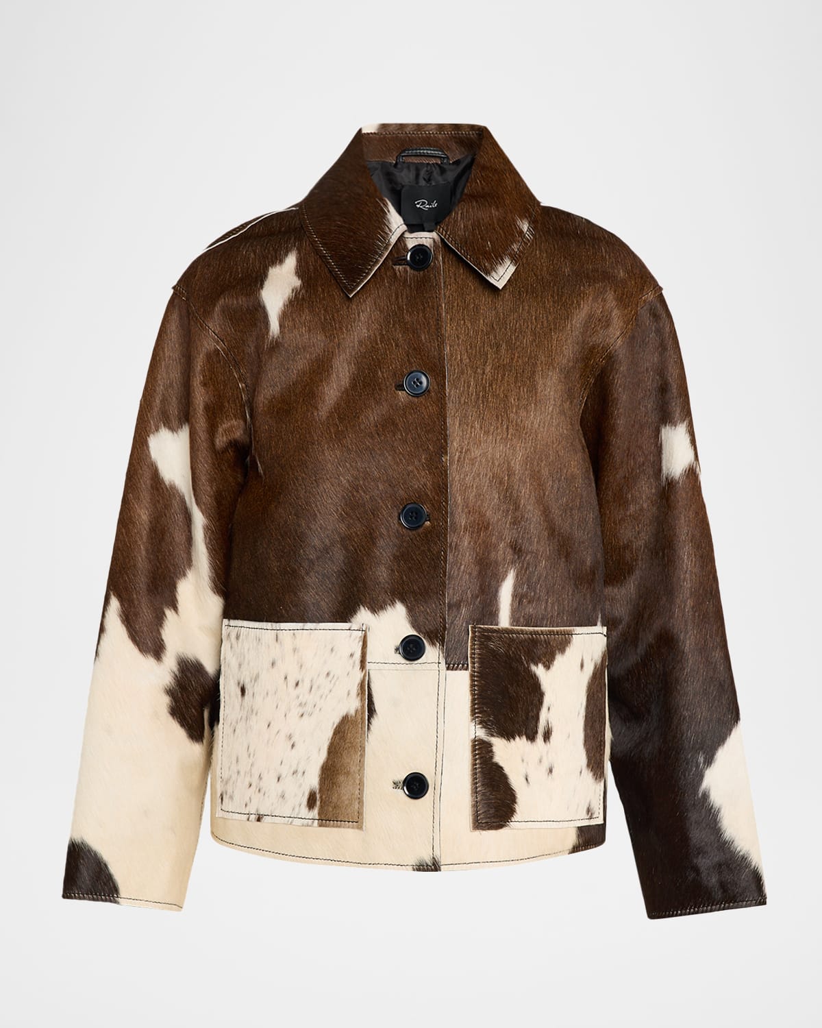 An effortless statement piece, the "Haisley" jacket by Rails is crafted from natural and dyed calf hair (India) with complementary tortoiseshell buttons Spread collar; button front Dropped shoulders Long sleeves Front patch pockets Relaxed fit Midlength Leather Imported