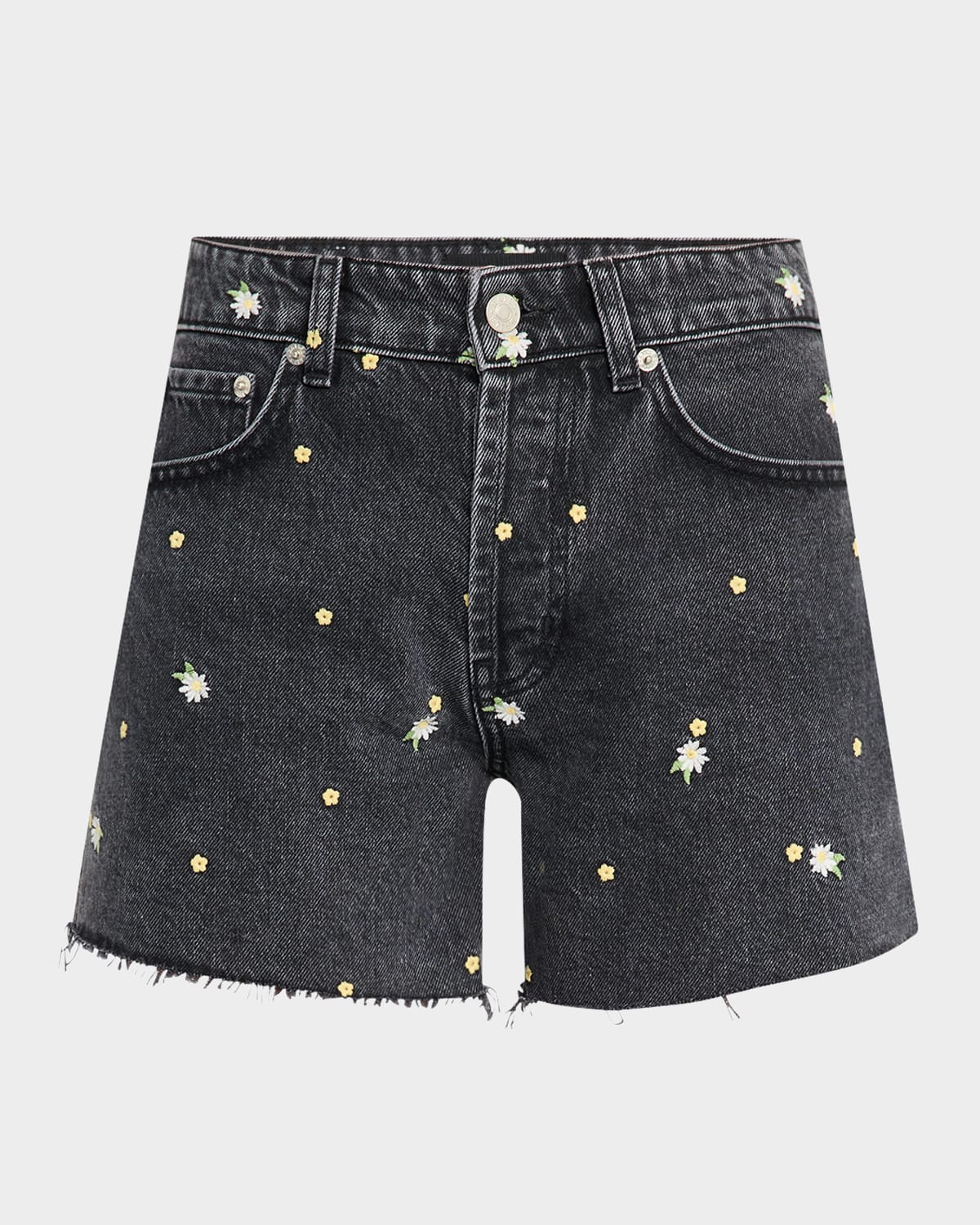 Rails "Mesa" jean shorts in blackwash denim with allover floral embroidery High rise Fivepocket style Raw hem Button/zip fly; belt loops Cotton Unlined Machine wash cold, tumble dry Imported