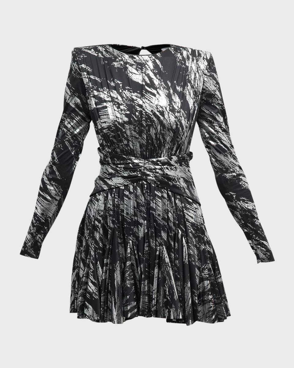 RAISAVANESSA dress in metallic striped lace High neckline Long sleeves; padded shoulders Gathered waist Fitandflare silhouette Mini length Godet hem Invisible back zip Polyester/spandex/Lurex® metallic fiber Dry clean Imported