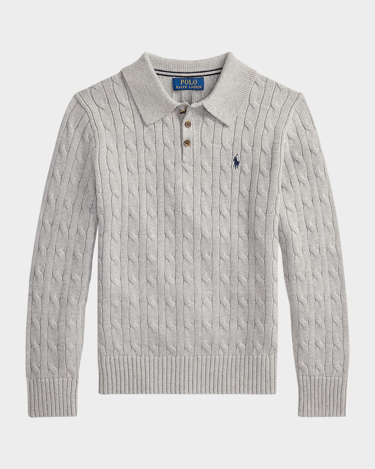 Ralph Lauren Childrenswear sweater crafted from combed cotton yarn in a classic cableknit motif Polo collar; threebutton placket Long sleeves with ribbed cuffs Signature embroidered Pony on the left chest Ribbed cuffs and hem Pullover style Cotton Imported