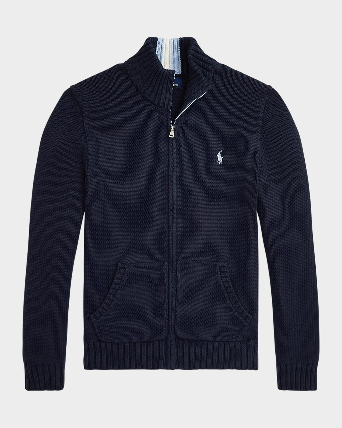Ralph Lauren Childrenswear chunkyknit sweater made from softcombed cotton and finished with the signature embroidered pony on the left chest Stand collar Long sleeves Split kangaroo pocket Zip font Ribknit hem Cotton Machine wash Imported