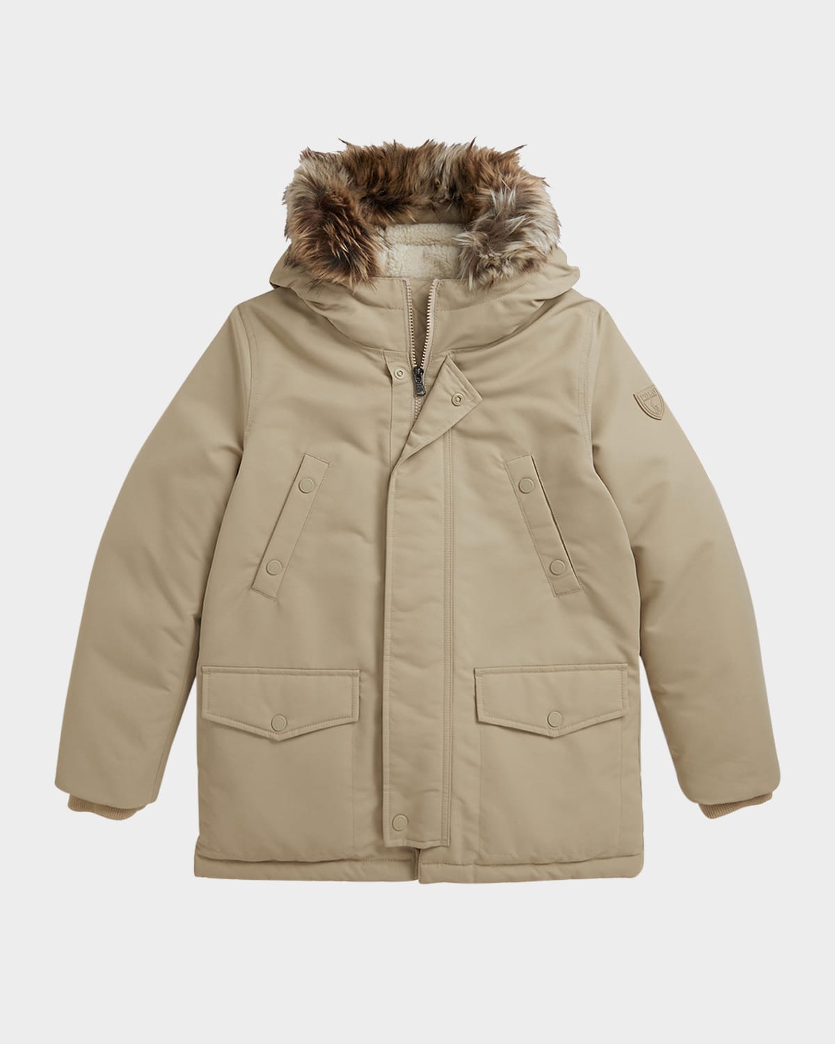 Crafted from waterresistant fabric, this Ralph Lauren Childrenswear surplusinspired parka is designed for cold weather and features a removable snapoff hood trimmed with faux fur (acrylic/modacrylic/polyester) Teddy fleecelined hood Long sleeves with interior ribbed cuffs "Polo Ralph Lauren" shield patch with signature Pony at the left sleeve Signature name tag label on the interior Two chest snapped pockets Two front waist snapped pockets Fully lined and filled with teddy fleece on the upper body Polyester/acrylic/nylon/polyamide Down/feather fill Lining: Acrylic/polyester Machine wash Imported
