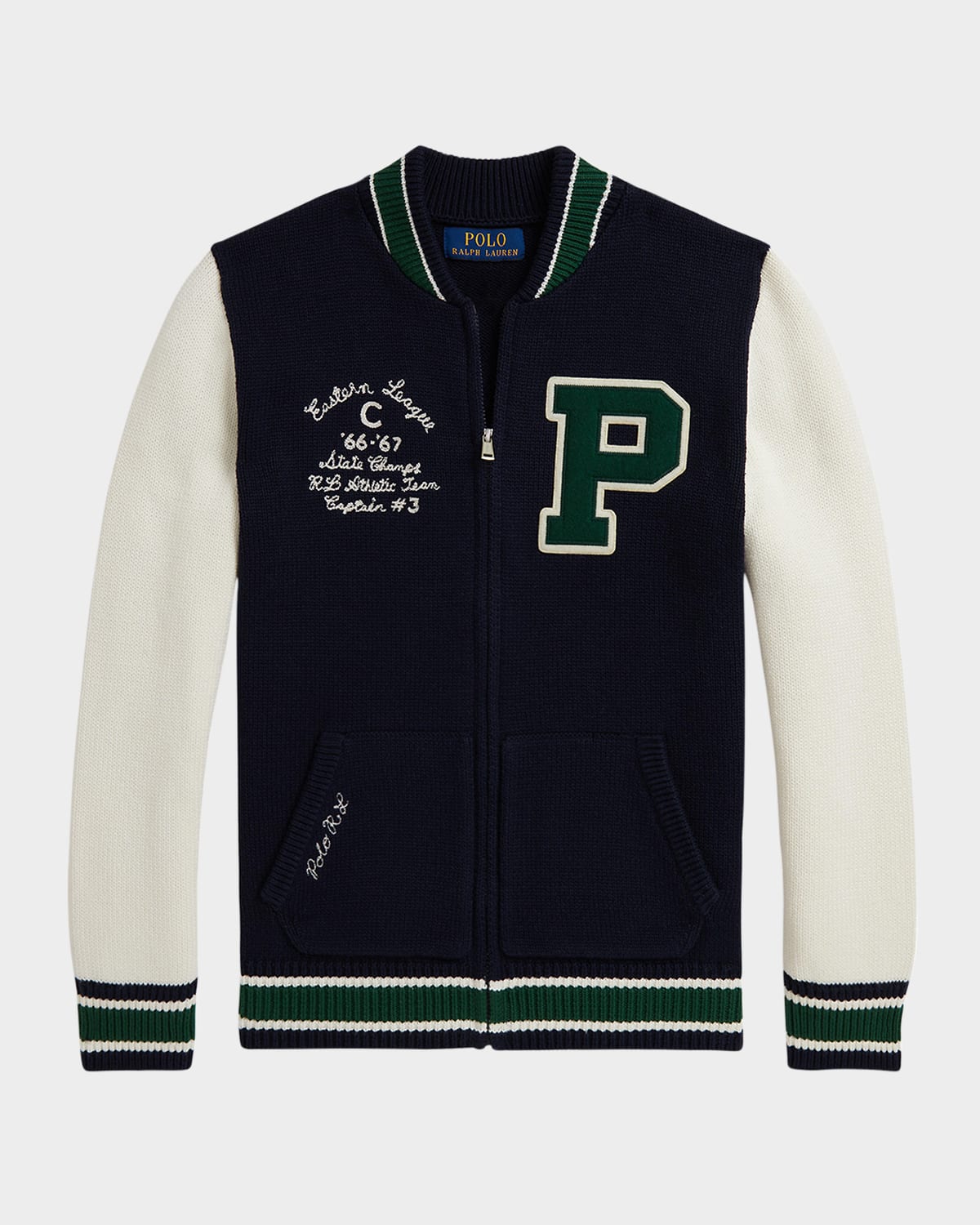 Ralph Lauren sweater reimagines the classic letterman jacket in a varsityinspired cotton knit with embroidered and intarsia details. Baseball collar; zip front Long sleeves Felt "P" patch on left chest Chainstitched "Eastern League '66-'67 State Champs RL Athletic Team" on the right chest Intarsiaknit "67" graphic on the center back Split kangaroo pockets Chainstitched logo script on right pocket Striped ribknit trim Pullover style Cotton Machine wash Imported