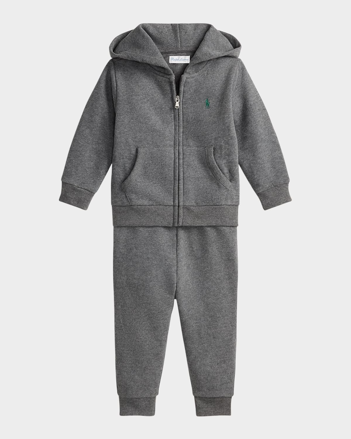 Ralph Lauren Childrenswear sporty set is made with a cottonblend fleece that's both lightweight and soft. Hoodie: signature embroidered pony on the left chest; hood; fullzip front; long sleeves with ribbed cuffs; split kangaroo pocket; ribbed hem. Pants: ribbed drawstring waistband with a pretied bow; ribbed leg openings. Cotton/polyester Machine wash Imported