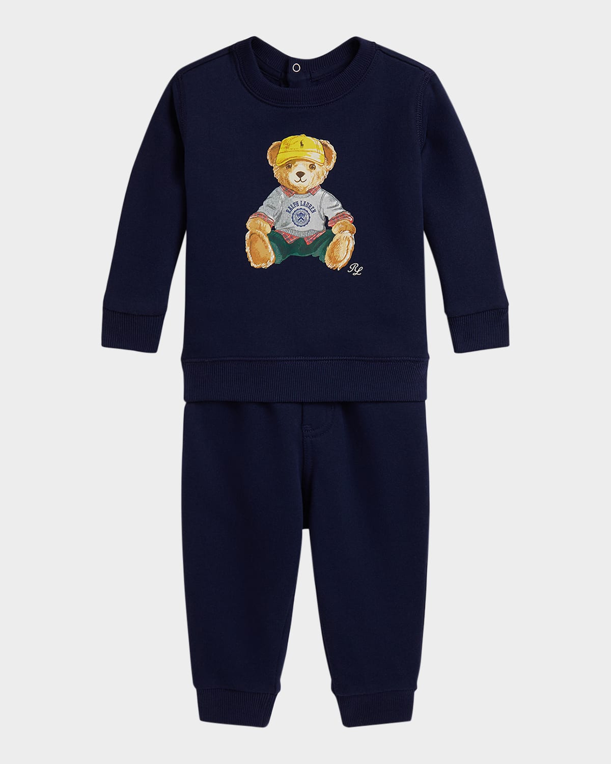 Ralph Lauren twopiece apparel set crafted from peached cottonblend fleece and then washed for even greater softness Sweatshirt: crew neckline; threesnap placket on the back neck; long sleeves with ribbed cuffs; Polo Bear and "RL" script printed on the center front; ribbed hem. Pants: ribbed drawstring waistband with a pretied bow; faux fly; ribbed leg openings Cotton/polyester Machine wash Imported
