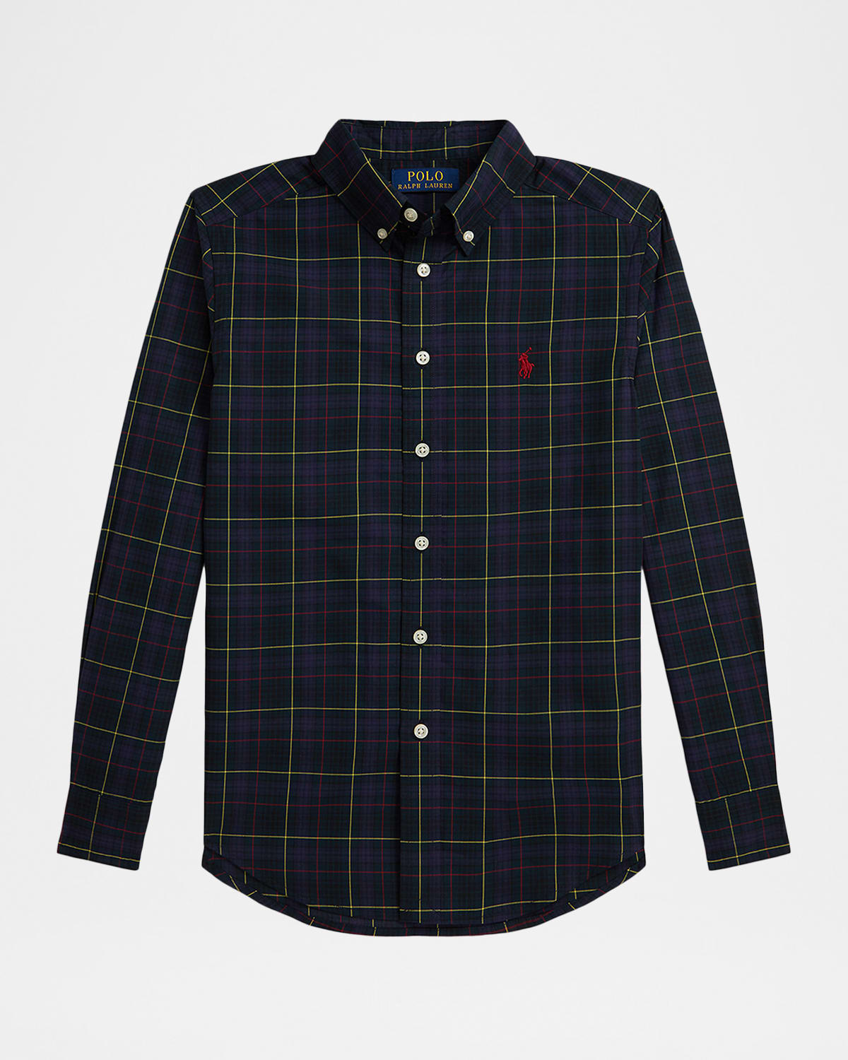 The Ralph Lauren Childrenswear poplin shirt is specially developed to provide a hint of stretch without elastane Approx. 24.3"L from shoulder to hem (size medium) Spread collar with button closure Long sleeves Buttoned barrel cuffs Signature embroidered Pony at left chest Boxpleated back yoke Curved hem Button front closure Cotton Machine wash Imported