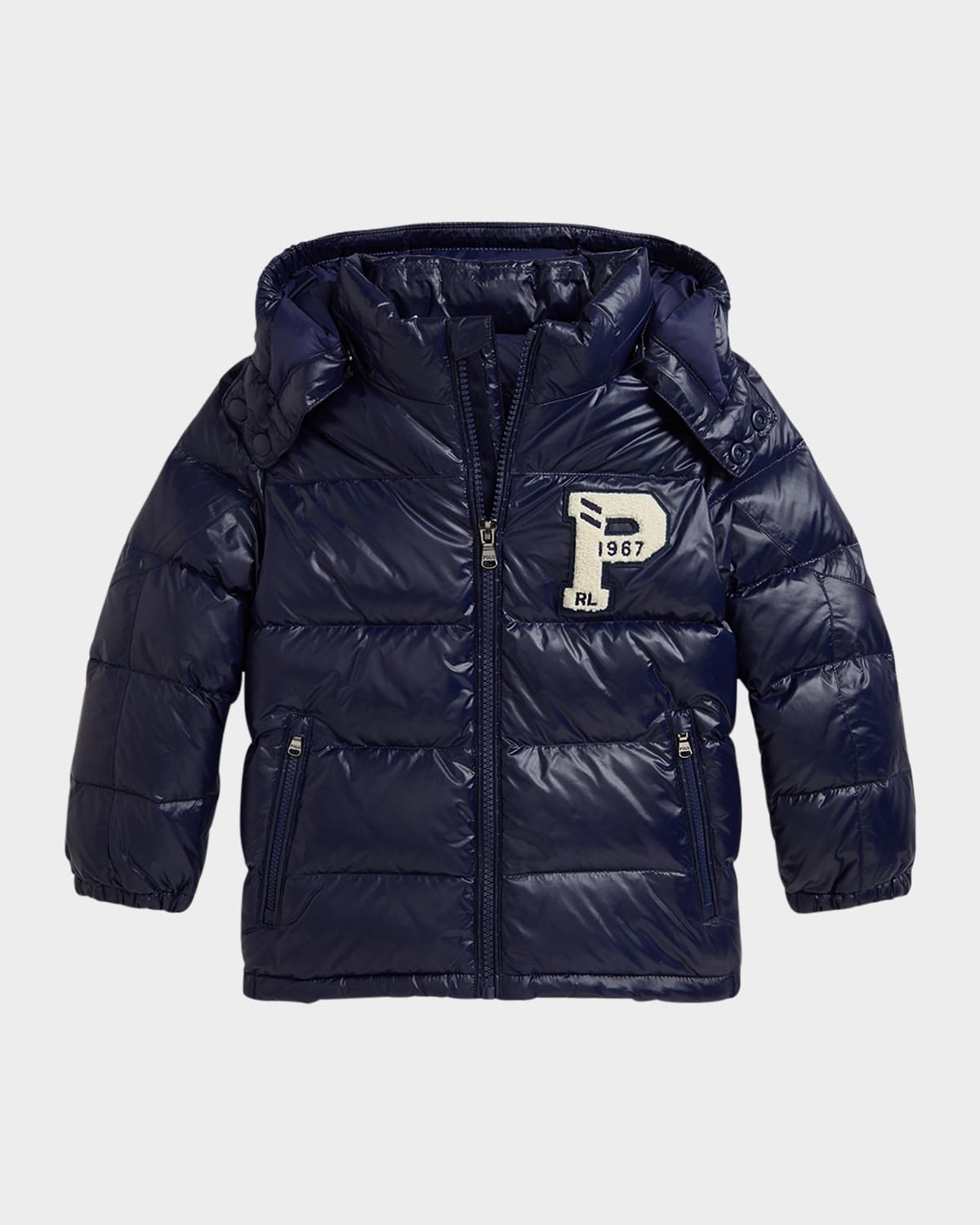 Ralph Lauren glossy down jacket developed with a waterrepellent shell and embroidered with a sporty chenille 'P' patch featuring 'RL' and '1967' motifs Removable hood Mock neckline; zip front Long sleeves with elasticized cuffs Two front waist zip pockets Elasticized hem 650fillpower down insulation Nylon/polyamide/recycled polyester Lining: Nylon Machine wash Imported