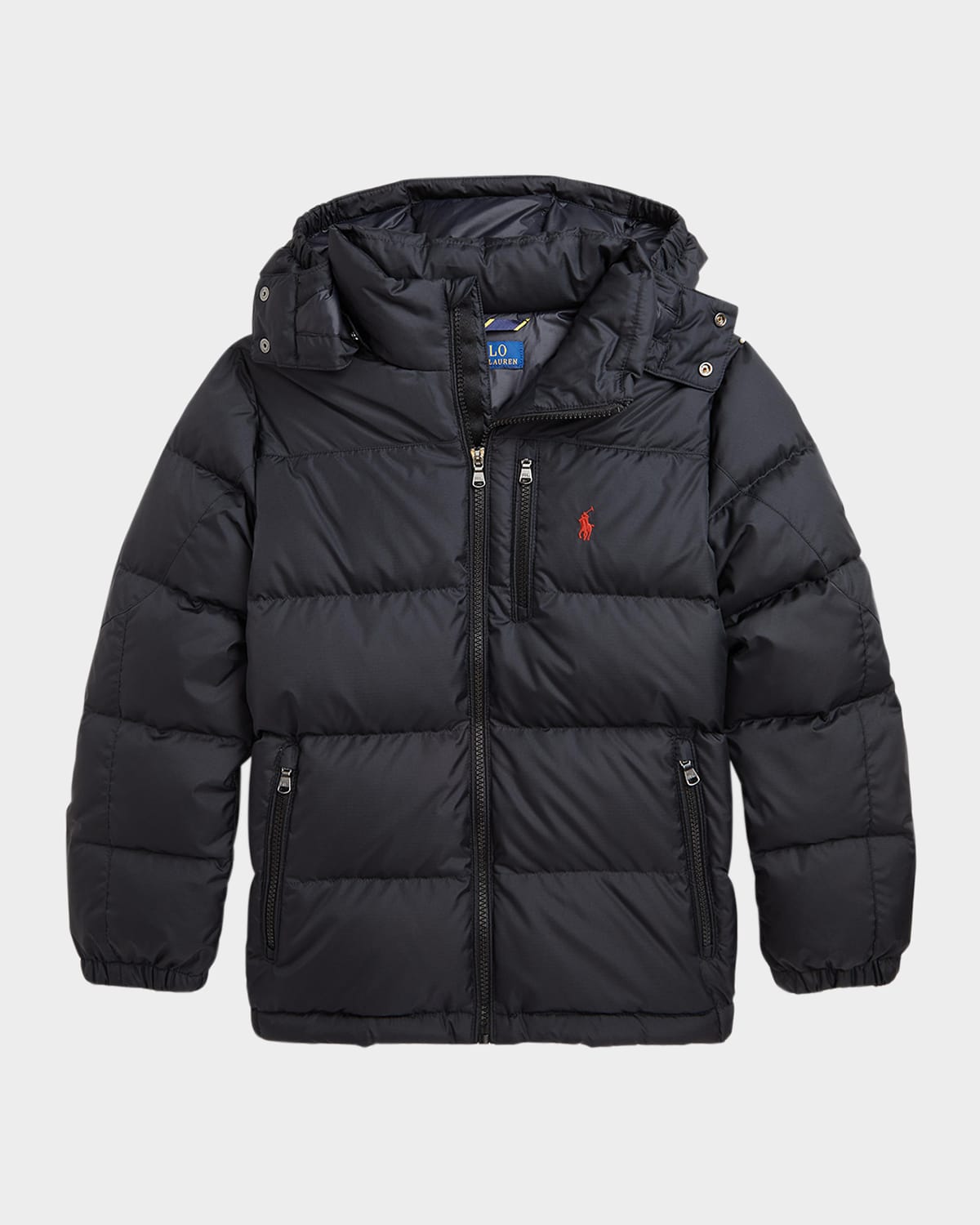 Ralph Lauren puffer bomber jacket crafted in waterrepellent recycled nylon ripstop fabric with signature embroidered pony on the left chest Hooded neckline; removable hood Full zip front Long sleeves Front zip pocket Side zip pockets Interior zip pocket Regular fit Down/polyester fill Polyester/nylon/polyamide Lining: Nylon Machine wash Imported