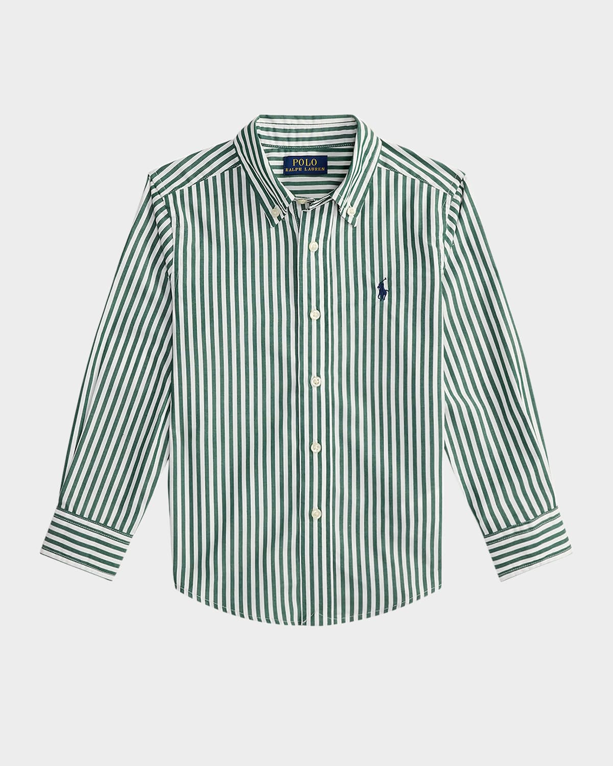 Ralph Lauren Childrenswear shirt in striped cotton poplin, specifically developed to provide a hint of stretch without elastane Signature embroidered pony on the left chest Spread collar Long sleeves Buttoned barrel cuffs Button front Boxpleated back yoke Shirttail hem Cotton Machine wash Imported