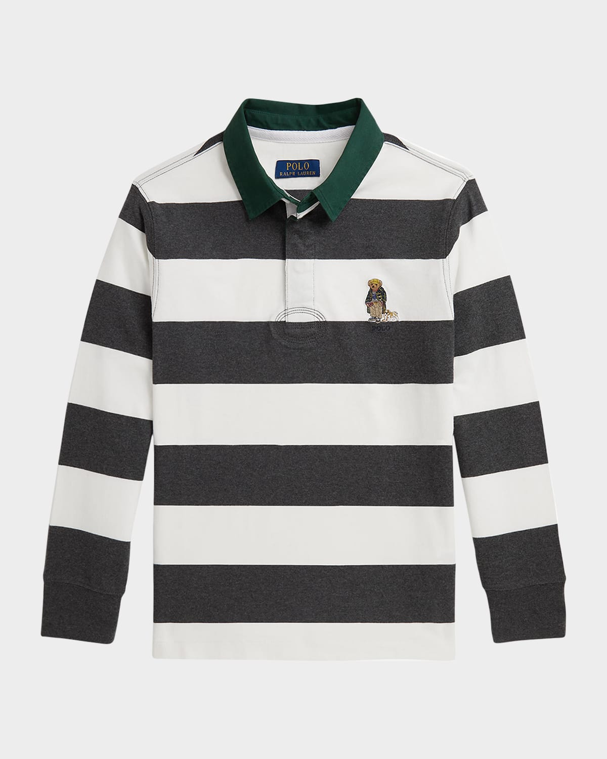 Ralph Lauren Childrenswear striped jersey shirt features the iconic Polo Bear wearing a signature RL outfit while walking a bulldog. Rugby collar; threebutton placket Long sleeves with ribbed cuffs Logo lettering embroidered on the left chest Vented hem Pullover style Cotton Machine wash Imported