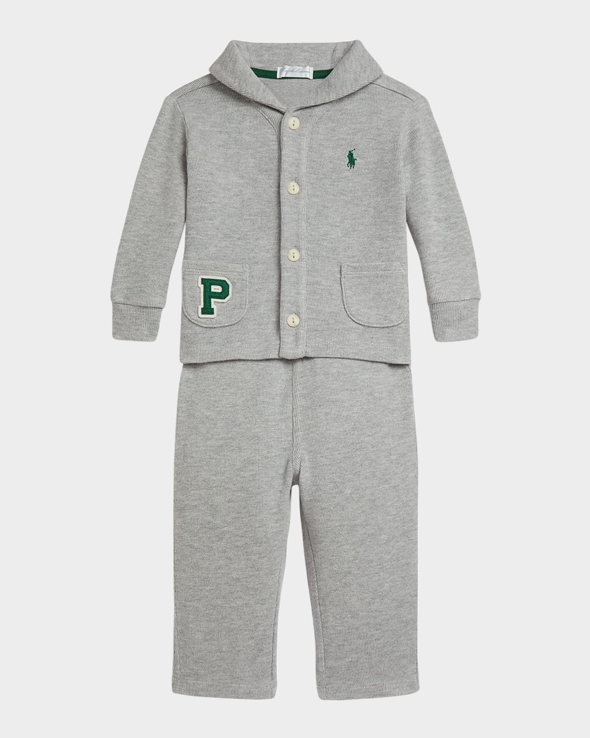 Part of the season's prep school-inspired concept, this Ralph Lauren Childrenswear set brings comfortable pants and a coordinating jacket that's finished with a "P" appliqué. Each piece is crafted from signature Estaterib fabric, which is peached for enhanced softness. Cardigan: signature embroidered Pony on the left chest; shawl collar; buttoned placket; long sleeves with banded cuffs; two front waist patch pockets; felt "P" appliqué on the right pocket. Pants: ribbed elastic waistband Cotton Machine wash Imported