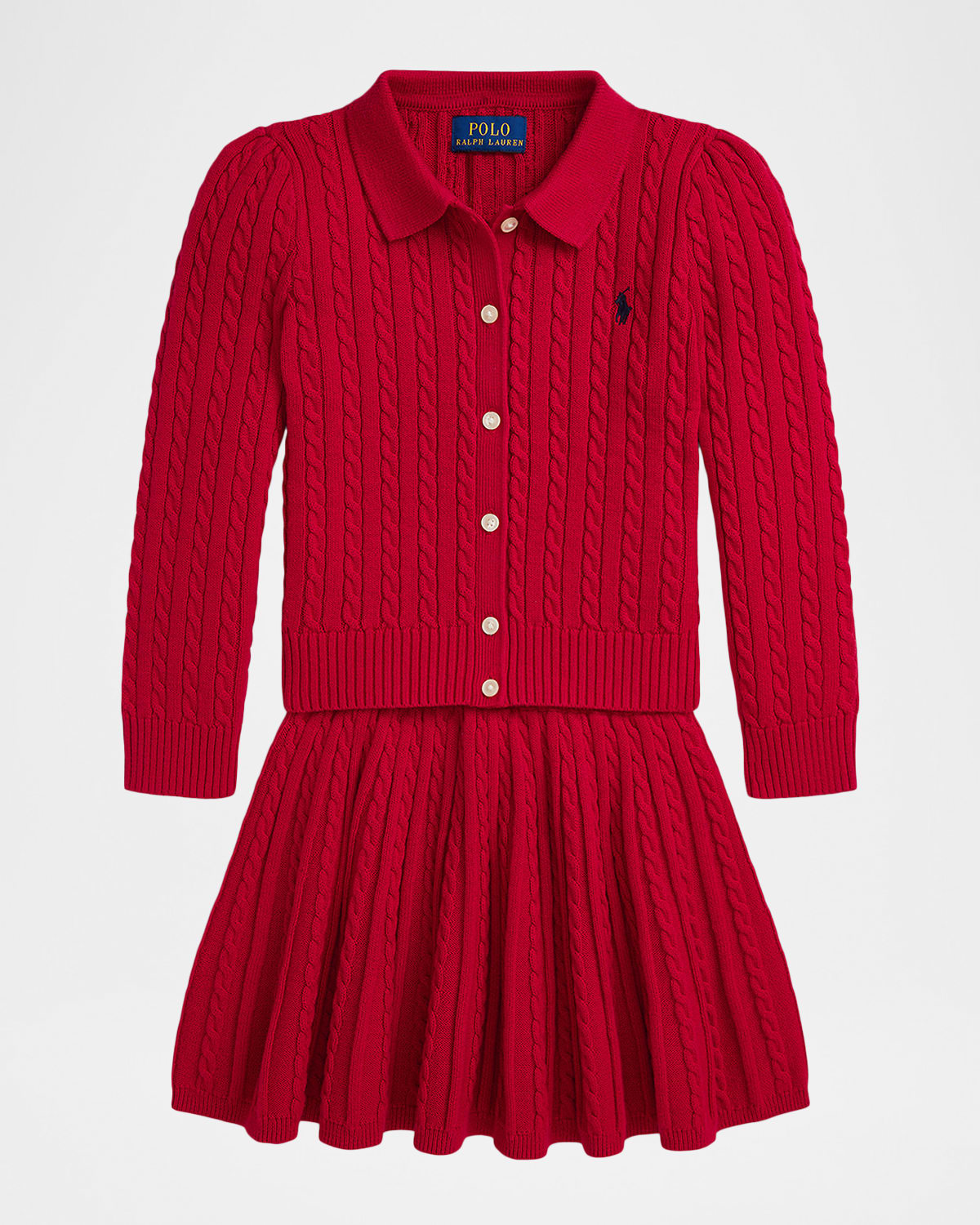This charming Ralph Lauren Childrenswear set includes a polo cardigan and skirt made with mediumweight combed cotton knit in a minicable pattern. The house's signature embroidered Pony completes the design. Ribknit polo collar Button placket Long sleeves Ribbed edges Matching skirt included Mini length Aline silhouette Slipon style 2piece set Cotton Machine wash Imported