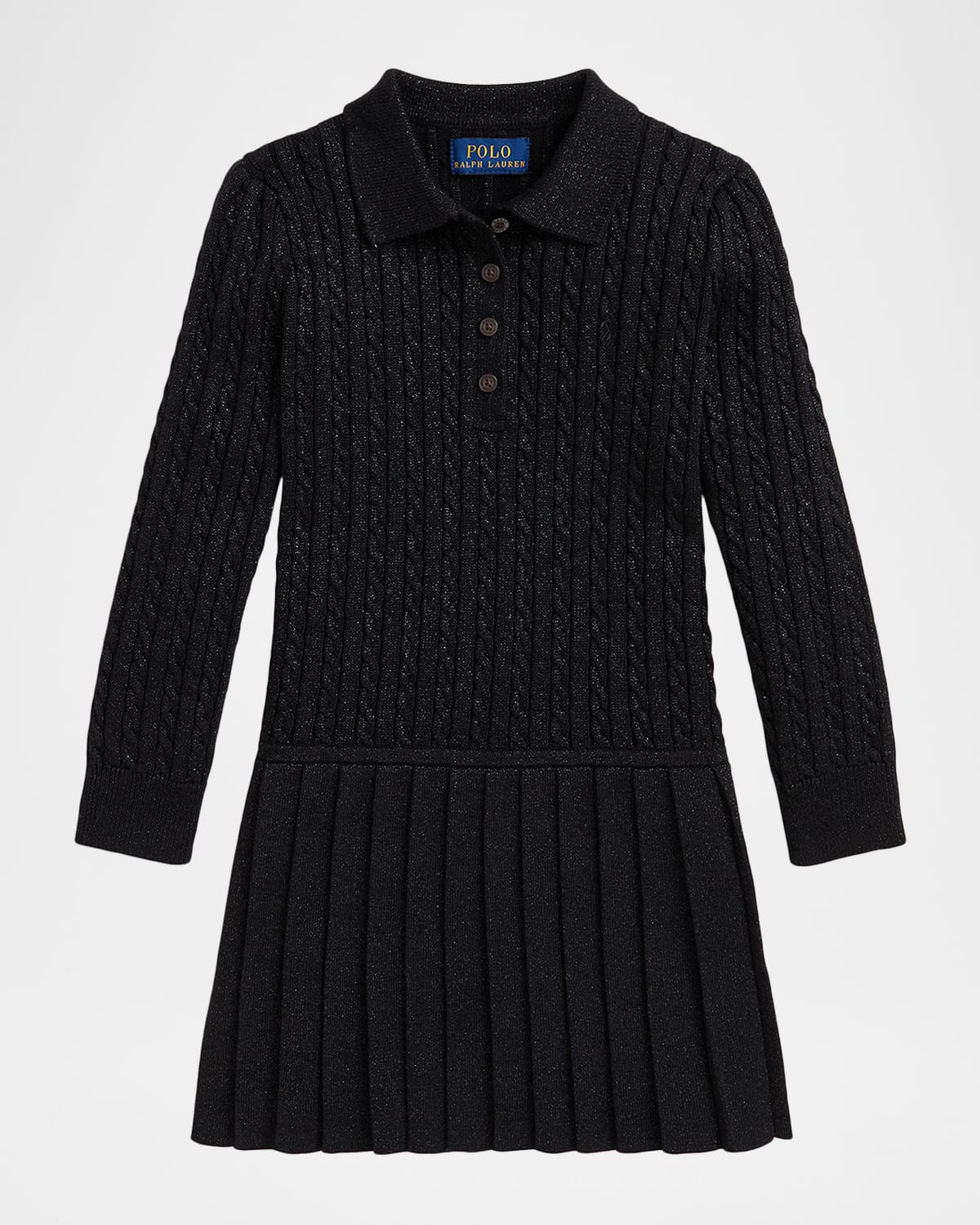 Ralph Lauren Childrenswear sweater dress is constructed with combed cotton as well as metallic yarns for a hint of shimmer. It unites a minicable pattern at the bodice with a pleated skirt. Approx. 22.3"L from shoulder to hem (size 4) Spread collar; threebutton placket Long sleeves with ribbed cuffs Signature embroidered Pony at the left chest Dropped waist Aline silhouette Slipover style Cotton/polyester/nylon/metallic fibers/elastane Machine wash Imported