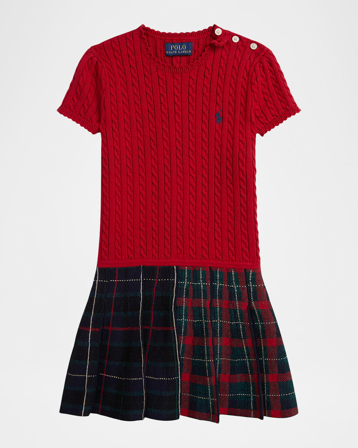 Part of the season's prep school-inspired concept, this Ralph Lauren Childrenswear combed cotton dress features a minicable pattern on the bodice and a pleated skirt in a mix of plaid motifs. Scalloped trim on the neckline and cuffs completes the design. Approx. 22.3"L from shoulder to hem (size 4) Crew neckline Short puff sleeves Threebutton shoulder placket Signature embroidered Pony on the left chest Dropped waist Hem hits around the knee Aline silhouette Slipover style Cotton Hand wash or dry clean Imported