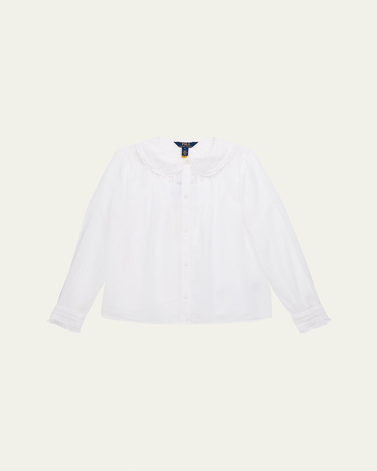 Ralph Lauren Childrenswear elegant cotton voile shirt is defined by pintucks on the bodice and a shirred back yoke Peter Pan collar Long sleeves Buttoned barrel cuffs with pintucks and ruffle trim Comes with a jersey camisole, which snaps into the top at the shoulders Cotton Machine wash Imported