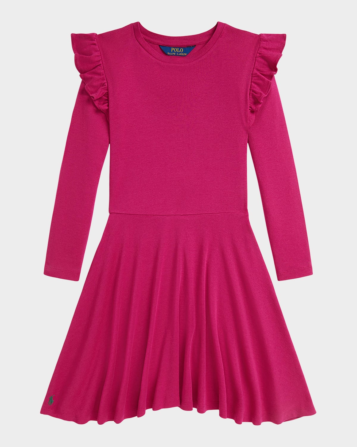Ralph Lauren Childrenswear dress made with a ribbed cotton blend and detailed with ruffle trim on the shoulders Crew neckline Long sleeves Signature embroidered Pony on the right hem Hem hits around the knee Fit amp; flare silhouette Pullover style Cotton/modal Machine wash Imported