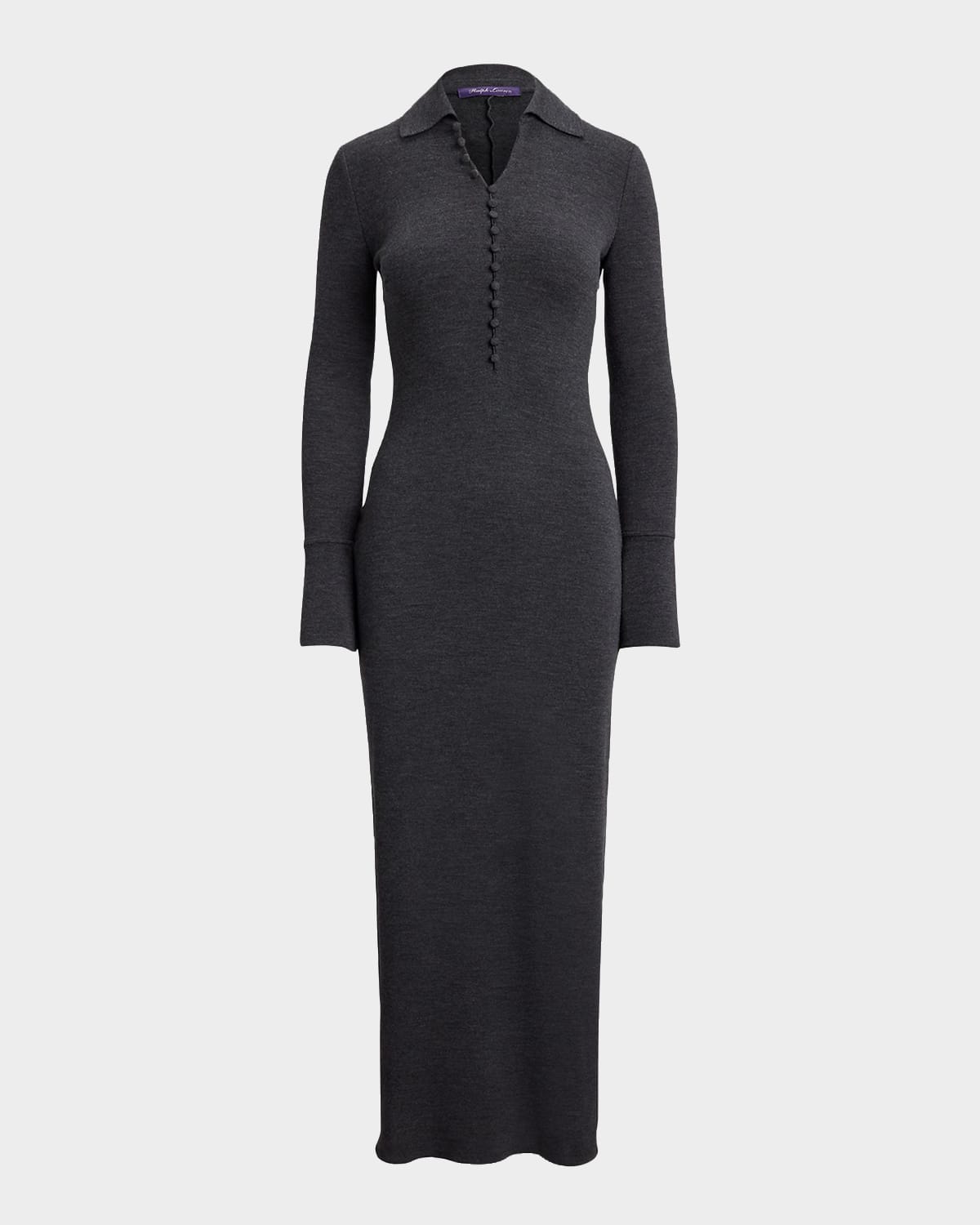 Ralph Lauren "Amberley" polo shirtdress knit in a soft melange wool V neckline; half button front Long sleeves Aline silhouette Hem falls below the knee Slipover style Wool Made in Italy