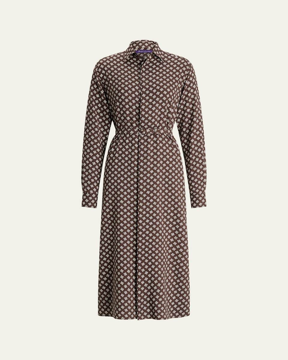 Ralph Lauren Collection "Noelle" stretch cady day dress in an art deco motif Spread collar; concealed button placket Long sleeves; button cuffs Side seam pockets Sheath silhouette Midi length Silk/elastane/leather Made in Italy