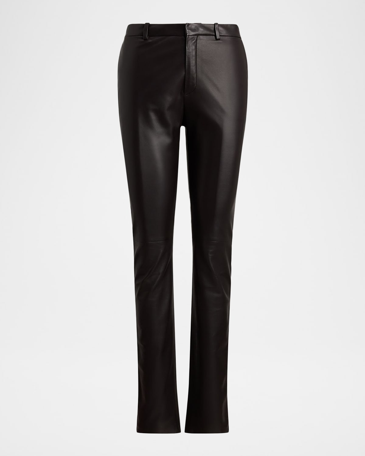 Ralph Lauren "Richie" pants in smooth nappa leather Mid rise sits high on hip Slim leg Full length Hook/zip fly; belt loops Leather Made in Italy