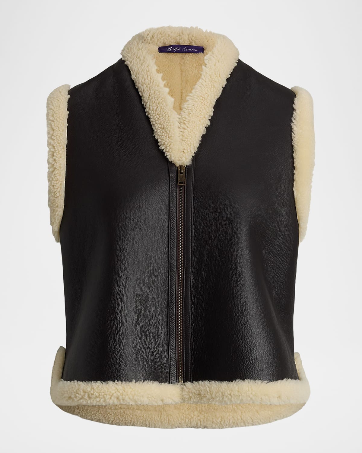 Ralph Lauren Collection "Tamlin" vest is crafted of dyed curly sheep shearling (Philippines) V neckline; zip front Sleeveless Straight fit Hip length Shearling Imported