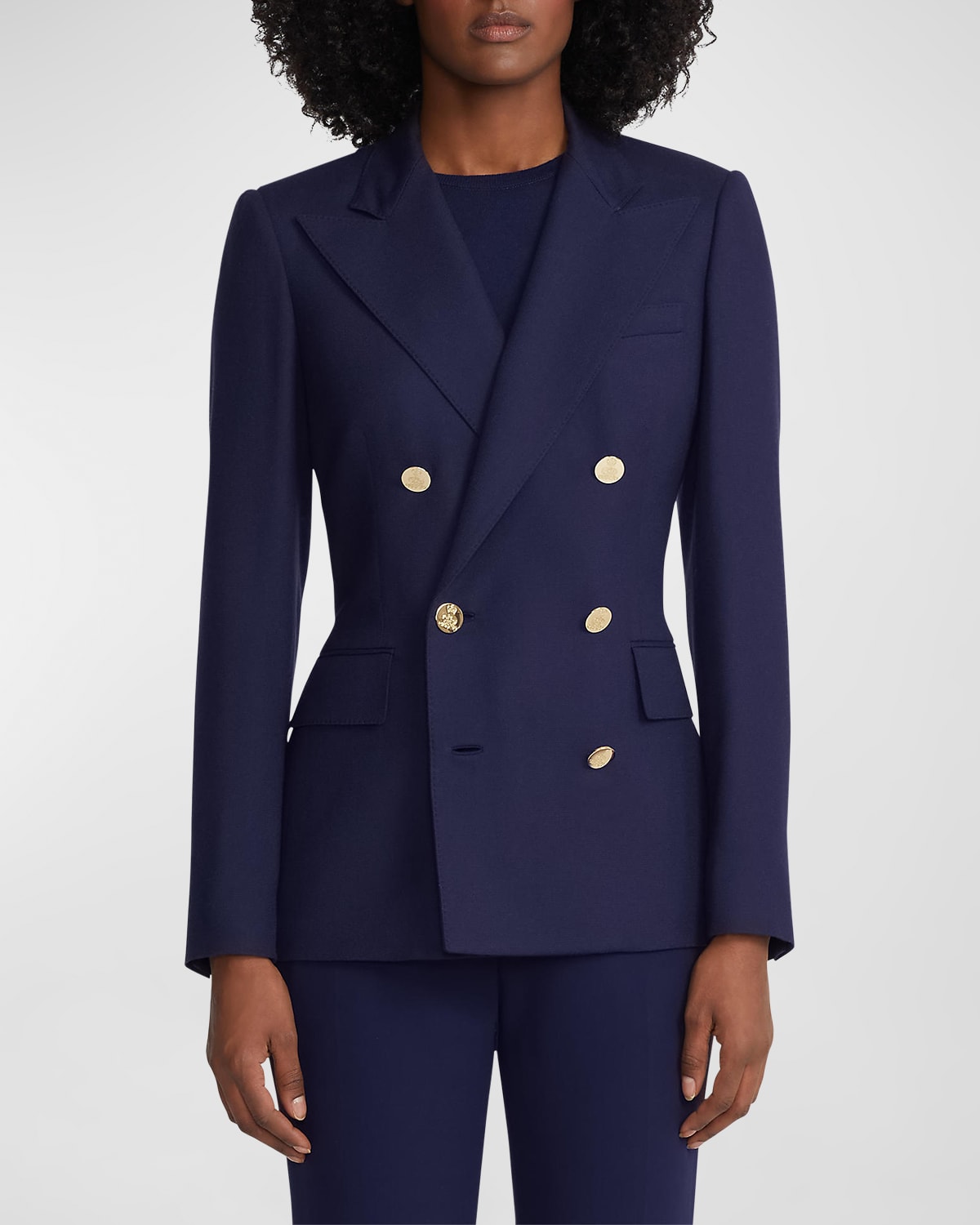 Slimmeddown straight fit. Approx. 28" front body length; 27" back body length; 33" sleeve length (Size 8). Peak lapels; doublebreasted silhouette; signature metal buttons. Long sleeves with fourbutton cuffs; shoulder pads. Left chest welt pocket; two front waist flapped pockets. Full silk lining. Shell: cashmere; lining: silk. Dry clean. Made in Italy.