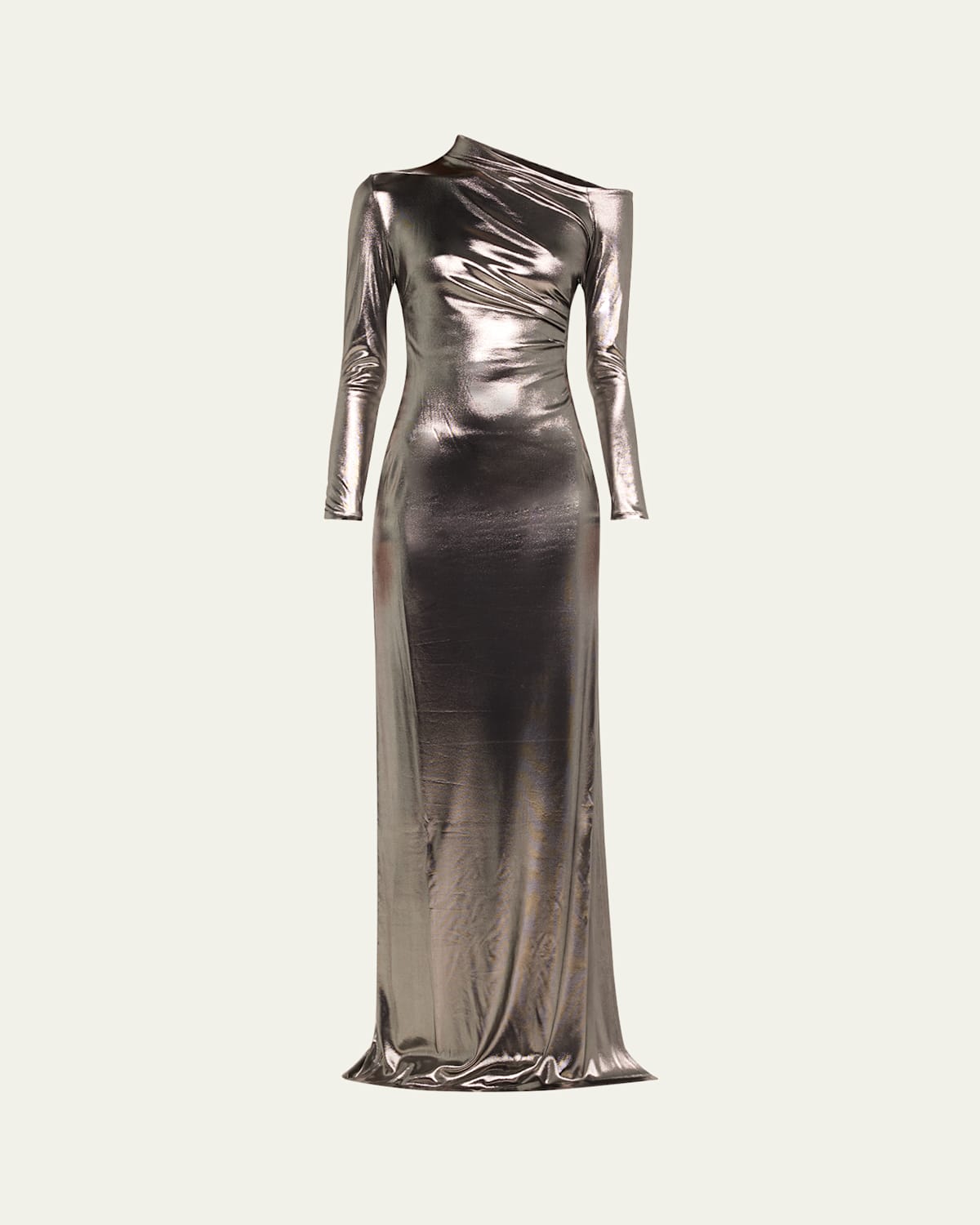 Ralph Lauren metallic gown featuring side ruching and a side slit High asymmetric neckline Long sleeves Column silhouette Floor sweeping hem Hidden closure Viscose Made in Italy