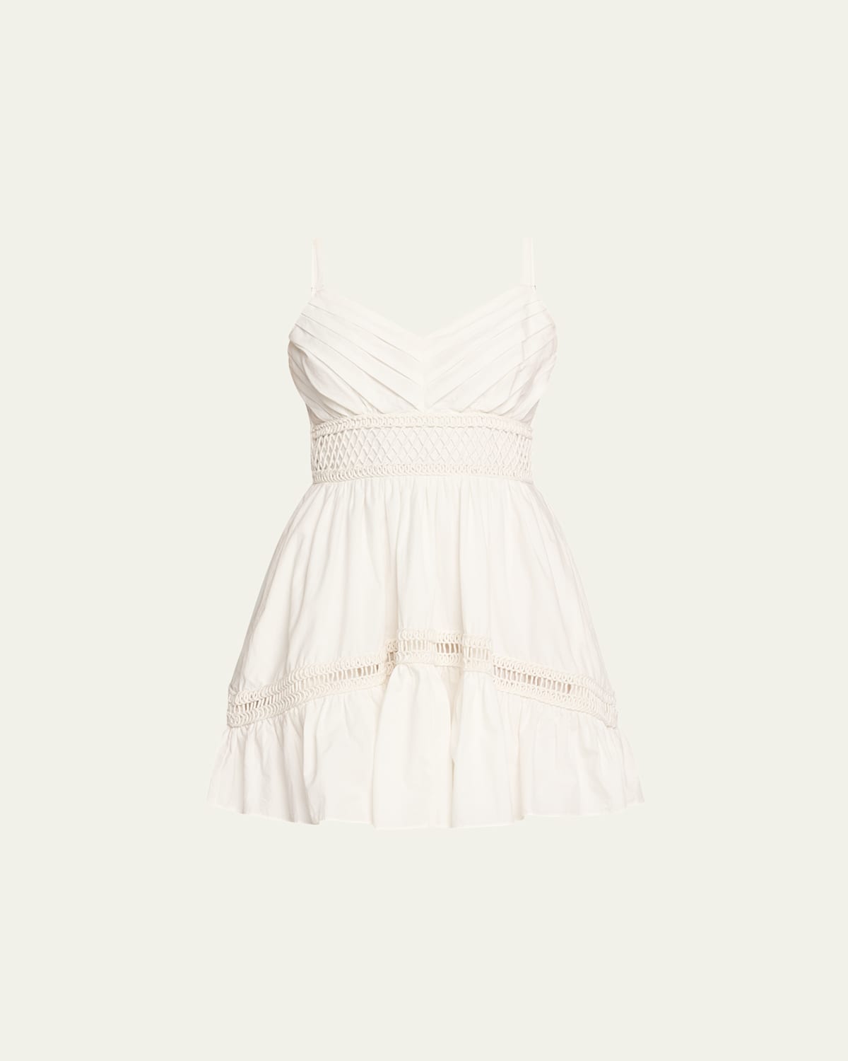 Ramy Brook "Amara" dress features pleating and lacework insets for added textural interest Approx. 33"L from shoulder to hem V neckline Sleeveless Hem falls above the knee Smocked back panel Slipover style Cotton Hand wash Imported