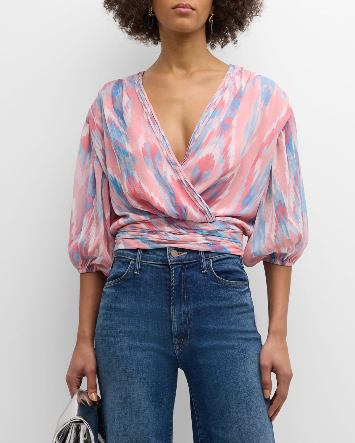 Ramy Brook "Blaire" blouse presented in an abstract print Approx. 25"L from shoulder to hem Surplice neckline 3/4 balloon sleeves; elastic cuffs Yoked back Hip length Smocked hem Slipover style Polyester Dry clean Imported