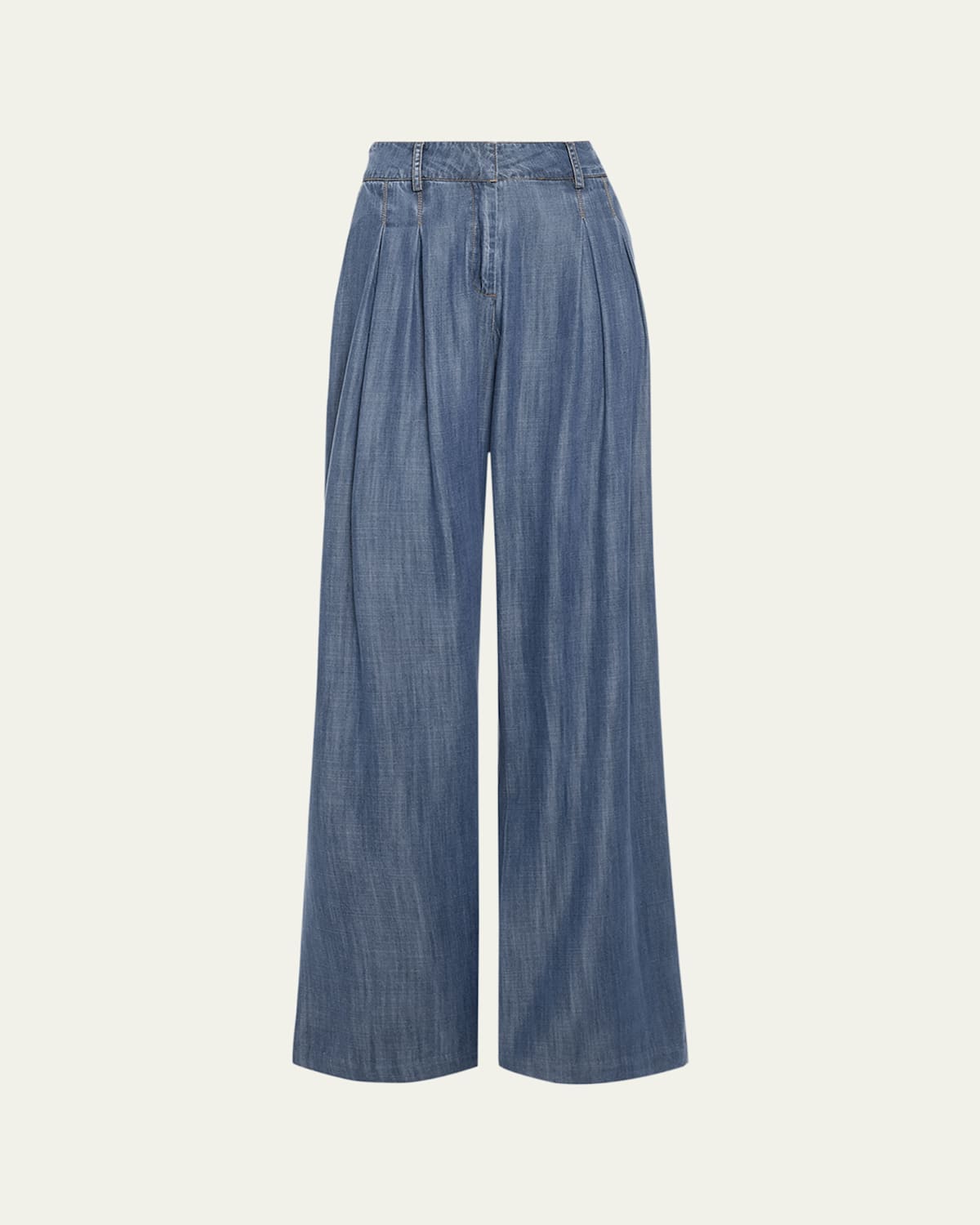 Finished with front pleating, the Oscar trousers by Ramy Brook are presented in a lyocell chambray fabrication Approx. 33" inseam High rise Slanted side and back welt pockets Full length Wide legs Hidden hook/zip fly; belt loops Tencel® lyocell Machine wash cold, tumble dry Imported