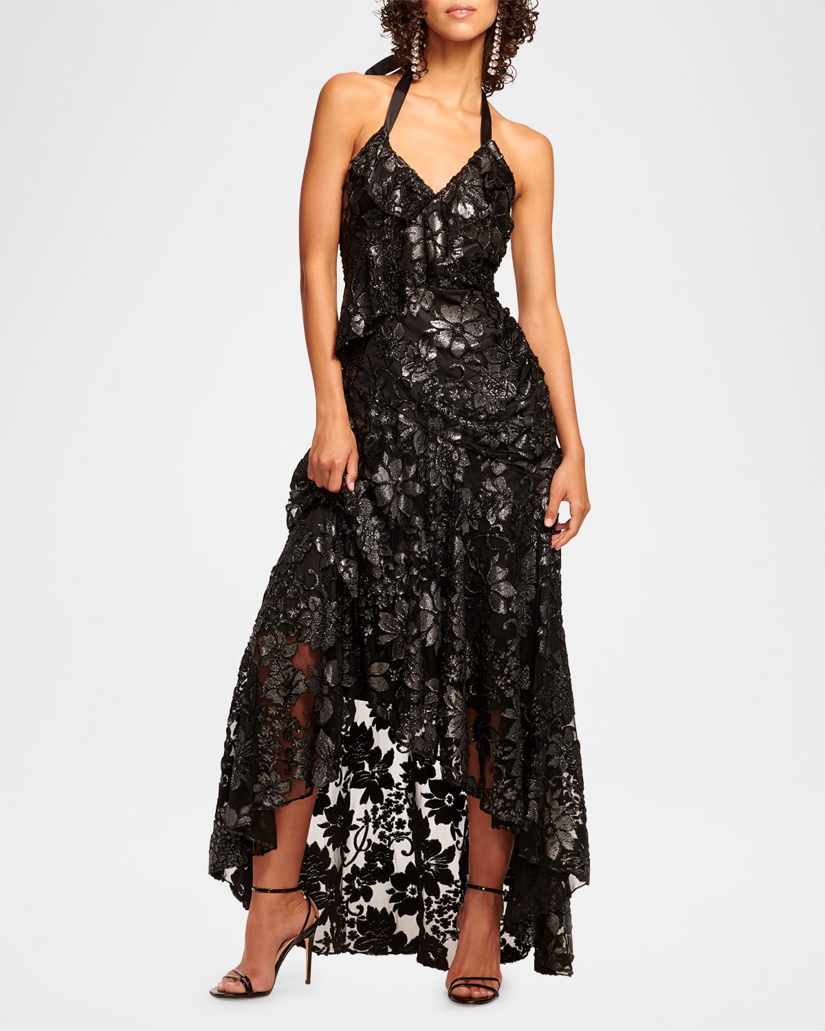 Ramy Brook "Chaplin" gown in metallic floral lace with ruffle details Halter V neckline; selftie behind the neck Sleeveless Highlow hem Full length Aline silhouette Polyester/nylon/polyamide/spandex Lining: Polyester/spandex Dry clean Imported