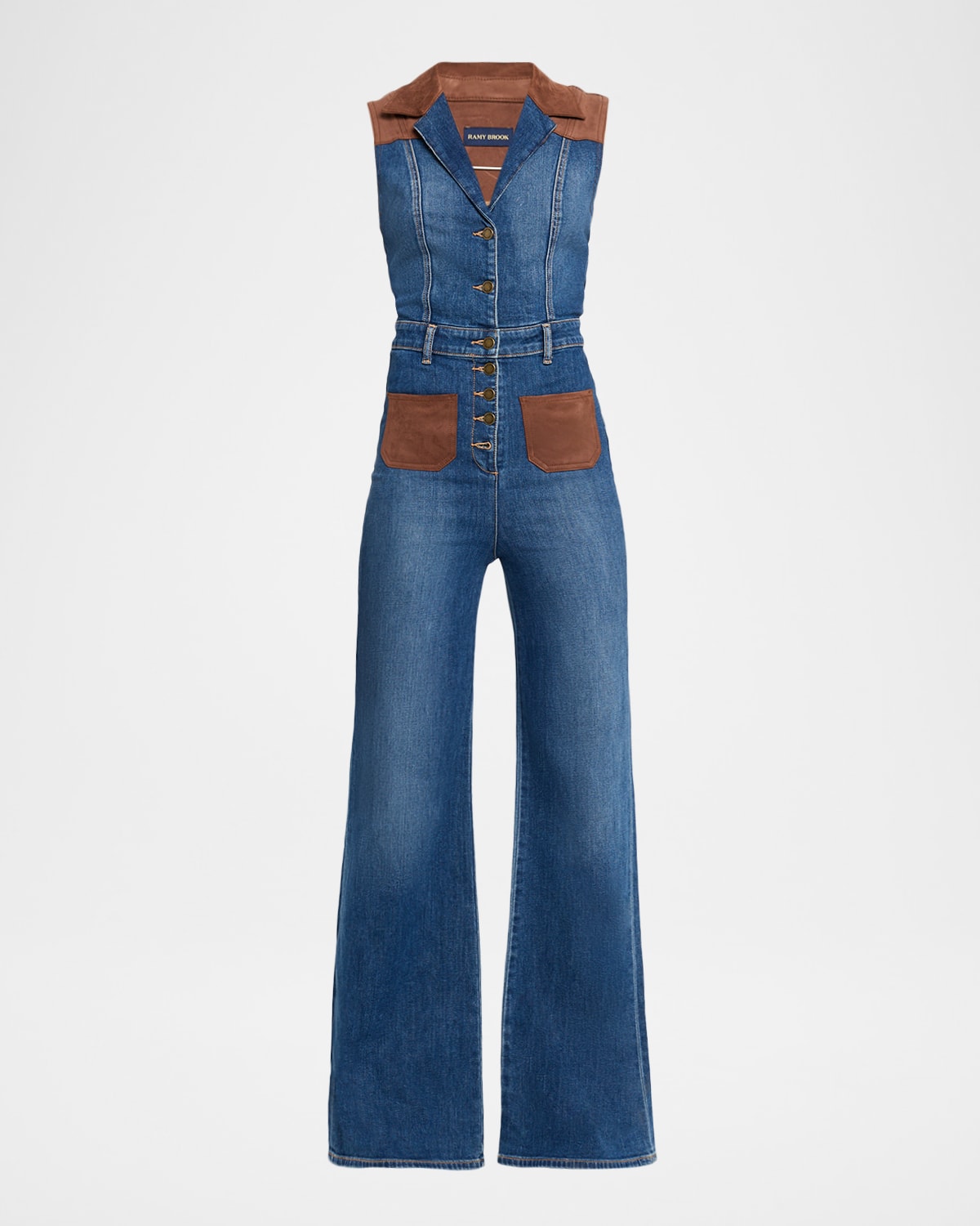 Complete with faux leather (PU) detailing for a modern edge, the "Claudette" jumpsuit by Ramy Brook is crafted from classic medium wash denim Approx. 63"L from shoulder to hem Collared V neckline Sleeveless Front and back patch pockets Full length Wide legs Button front closure Cotton/polyurethane Machine wash cold, tumble dry, wash inside out Imported