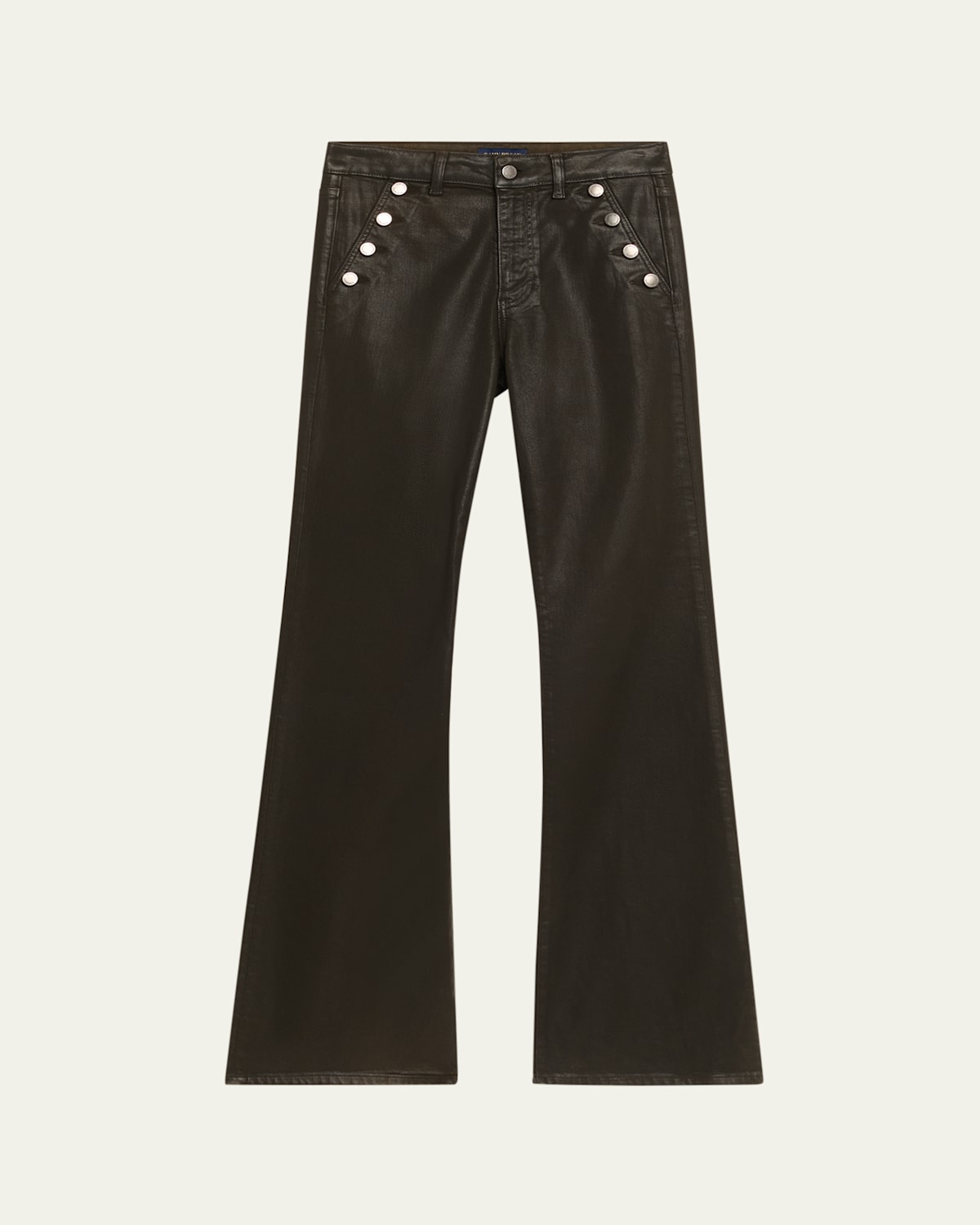Crafted from stretch denim with a coated finish for an elevated look, the Helena jeans by Ramy Brook feature engraved silvertone buttons Approx. 33" inseam High rise Fourpocket style Full length Flared legs Button/zip fly; belt loops Cotton/lyocell/elastane Dry clean Imported
