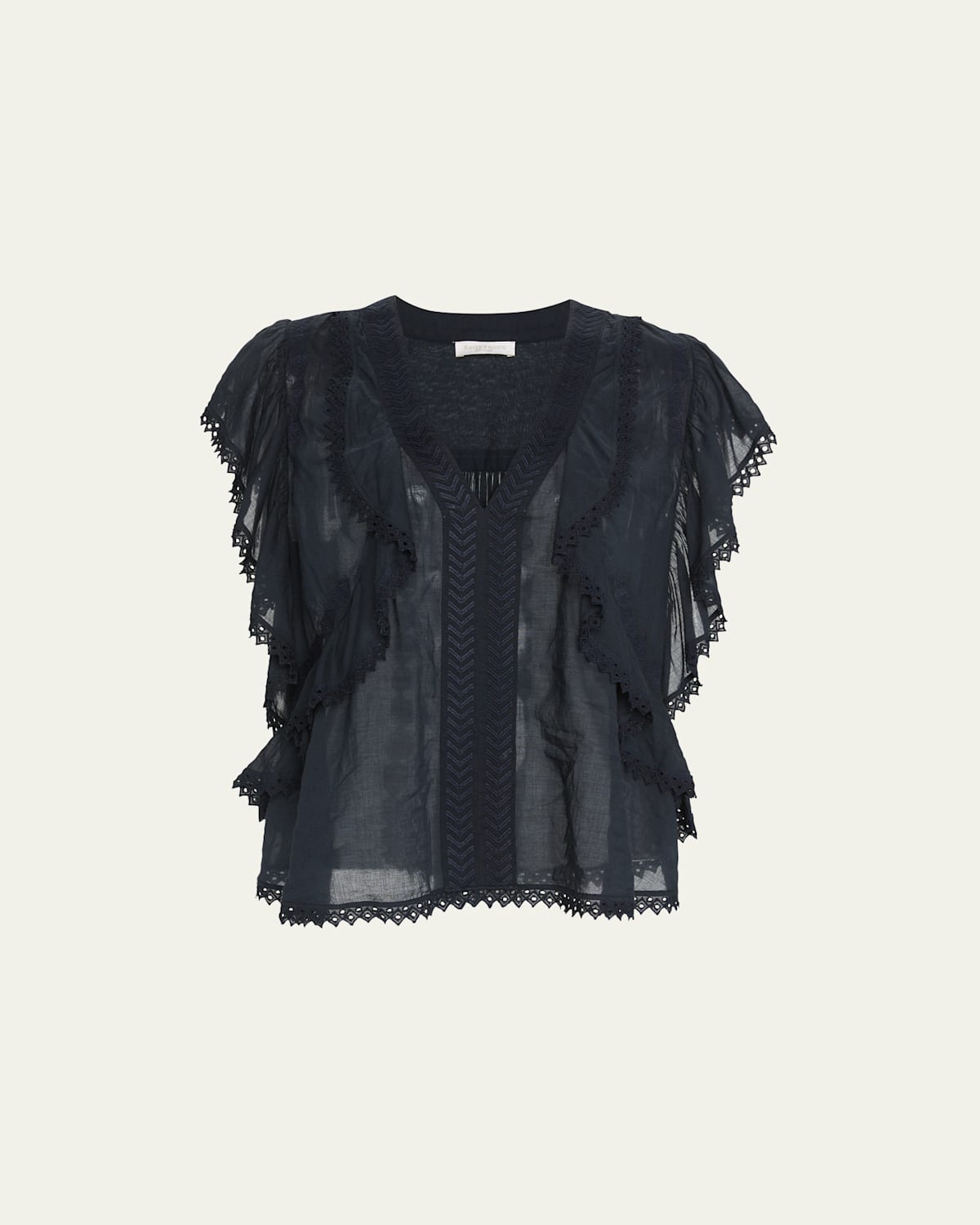 Ramy Brook "Della" top in lightweight cotton voile with lace trim VNeck Short sleeves Yoked back Slipover style Cotton Unlined Dry clean Imported