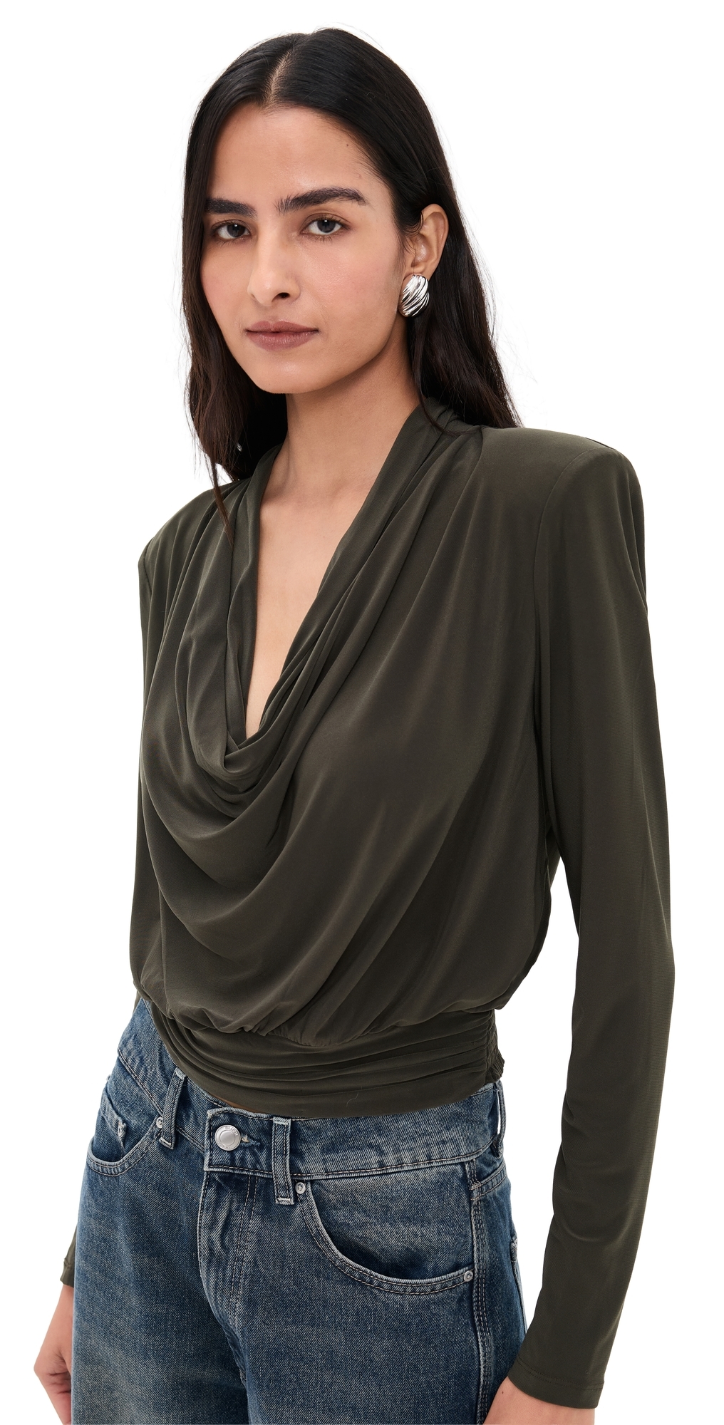 Fabric: Lightweight, super-stretch jersey. Smocked elastic at back. Shoulder pads. Ruched waist. Bias cut. Cowl neck. Long sleeves. Shell: 96% polyester/4% spandex. Dry clean. Imported, China. Measurements: Measurements from size XS Length: 20.5in / 52.0cm, from shoulder