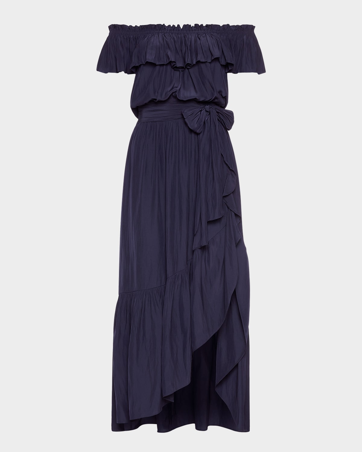 Ramy Brook "Gloria" dress in a pleated construction Approx. 42"L from shoulder to hem Offtheshoulder neckline Short sleeves Smocked waistband with a selftie sash belt Ruffled hem falls below the knee Slipon closure Polyester Dry clean Imported