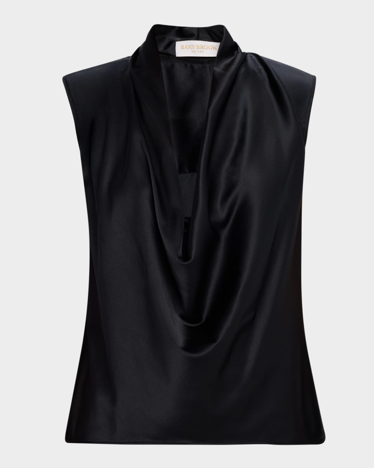 The Gregory blouse by Ramy Brook is crafted from lustrous stretch silk in a draped silhouette Approx. 25"L from shoulder to hem Cowl neckline Sleeveless Hip length Slipover style Silk/spandex Dry clean Imported