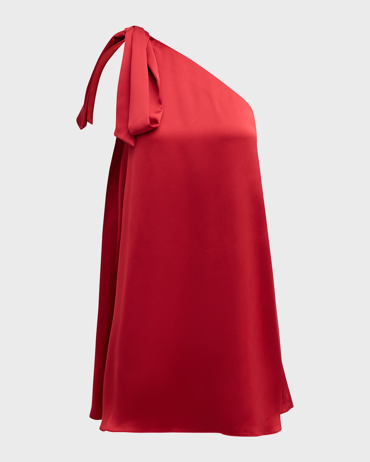 Ramy Brook "Harmoni" satin mini dress features a draping shoulder bow Approx. 33"L from shoulders to hem Oneshoulder neckline Sleeveless Hem falls above the knee Shift silhouette Invisible side zipper Polyester Dry clean Imported
