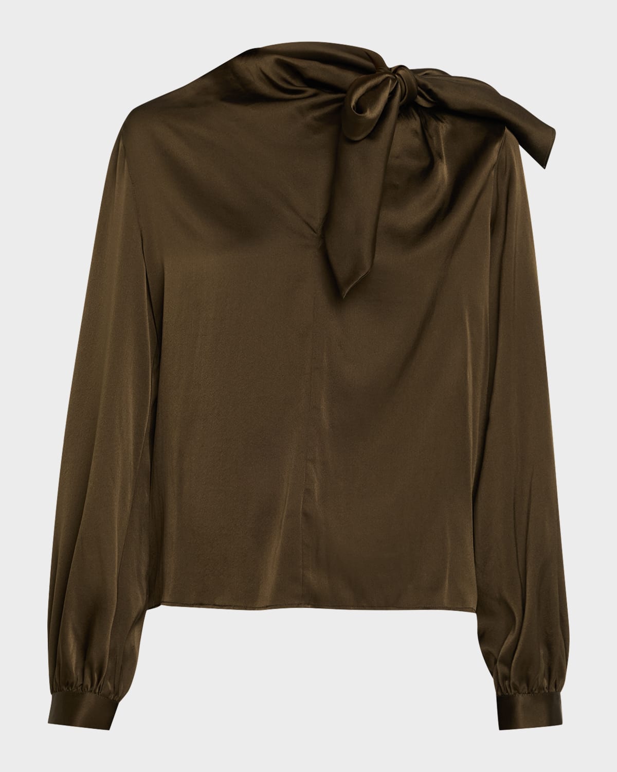 Draped with a selftie shoulder bow, the Harry blouse by Ramy Brook is crafted from lustrous silk with a hint of stretch for a comfortable fit Approx. 25"L from shoulder to hem High neckline Long blouson sleeves; button cuffs Relaxed fit Hip length Slipover style Silk/spandex Dry clean Imported