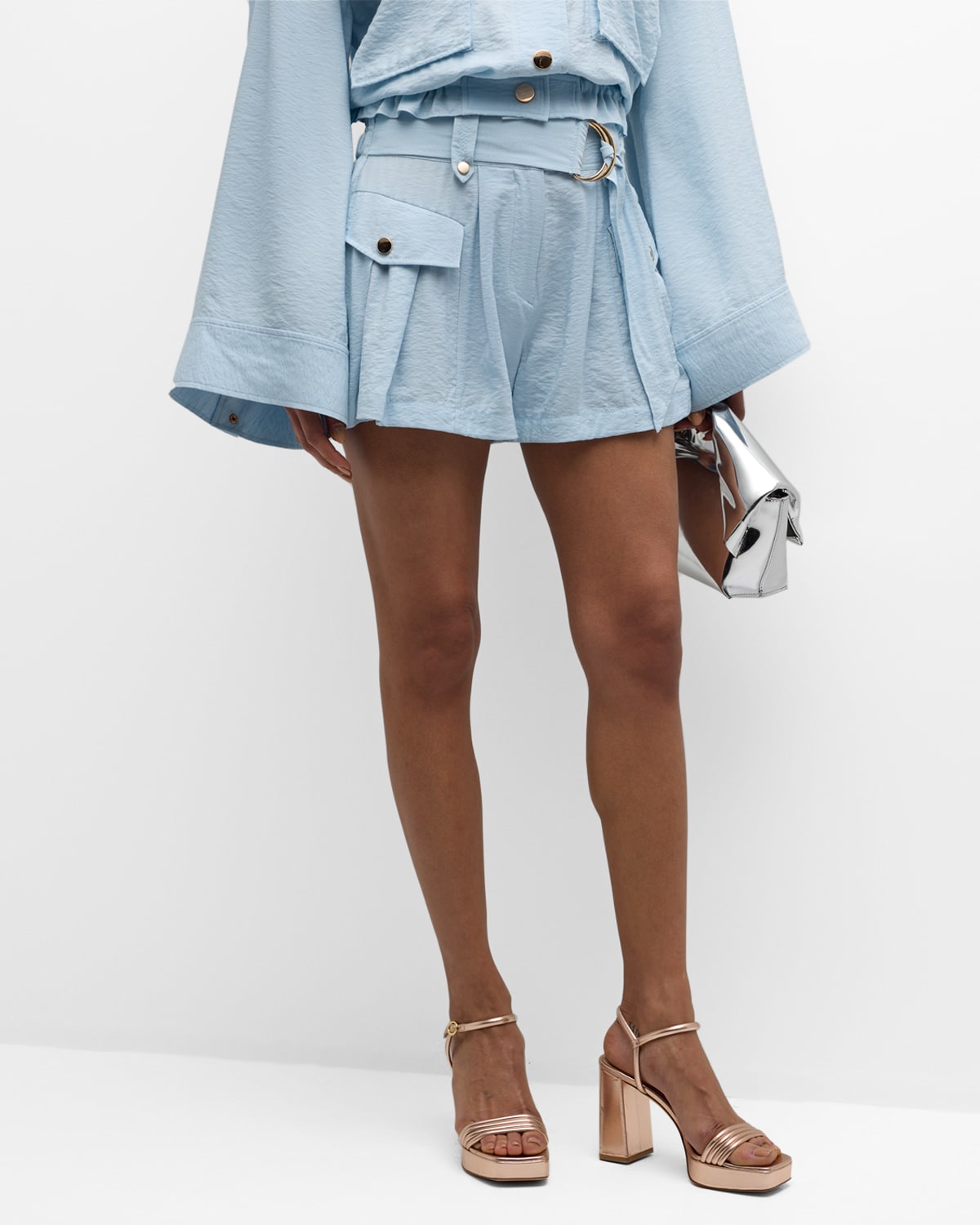 Ramy Brook "Haylee" shorts crafted from a textured twill fabrication with shiny goldtone hardware Approx. 2.5" inseam High rise Dring belted waist Side flap pockets with snap closures Relaxed legs Hidden button/zip fly; belt loops Polyester Dry clean Imported