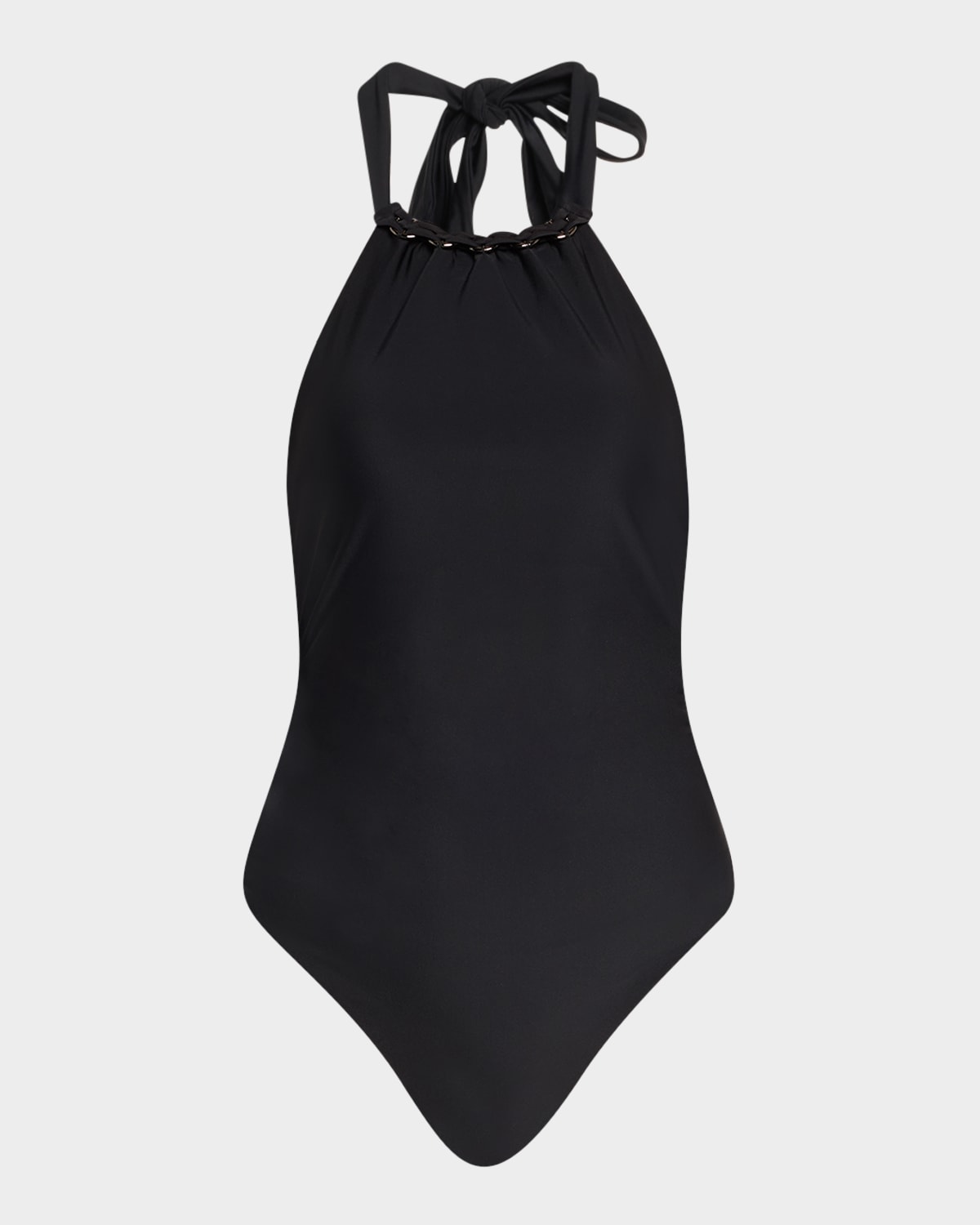 Ramy Brook "Jasmyne" solid onepiece swimsuit with tonal ring accents Halter neckline; selfties behind the neck Shelf bra Moderate seat coverage Nylon/polyamide/spandex Lining: Polyester/spandex Hand wash, wash separately Imported