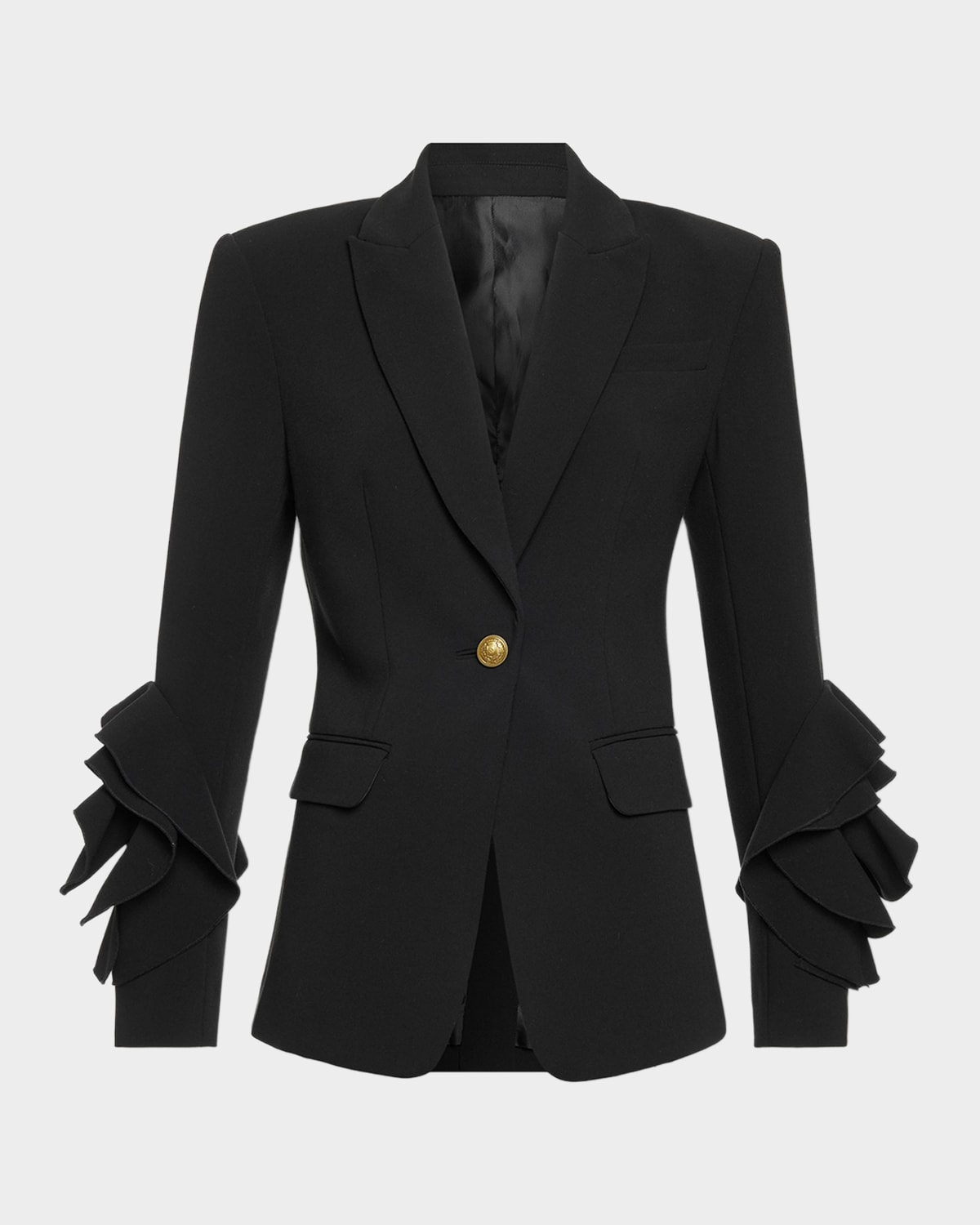 The Leah blazer by Ramy Brook is expertlytailored in a waistdefining silhouette with cascading ruffle cuffs Approx. 26"L from shoulder to hem Peak lapels; singlebreasted front Strong padded shoulders Long sleeves Single chest welt pocket Hip flap pockets Midlength Polyester/viscose/elastane Lining: Polyester/spandex Dry clean Imported