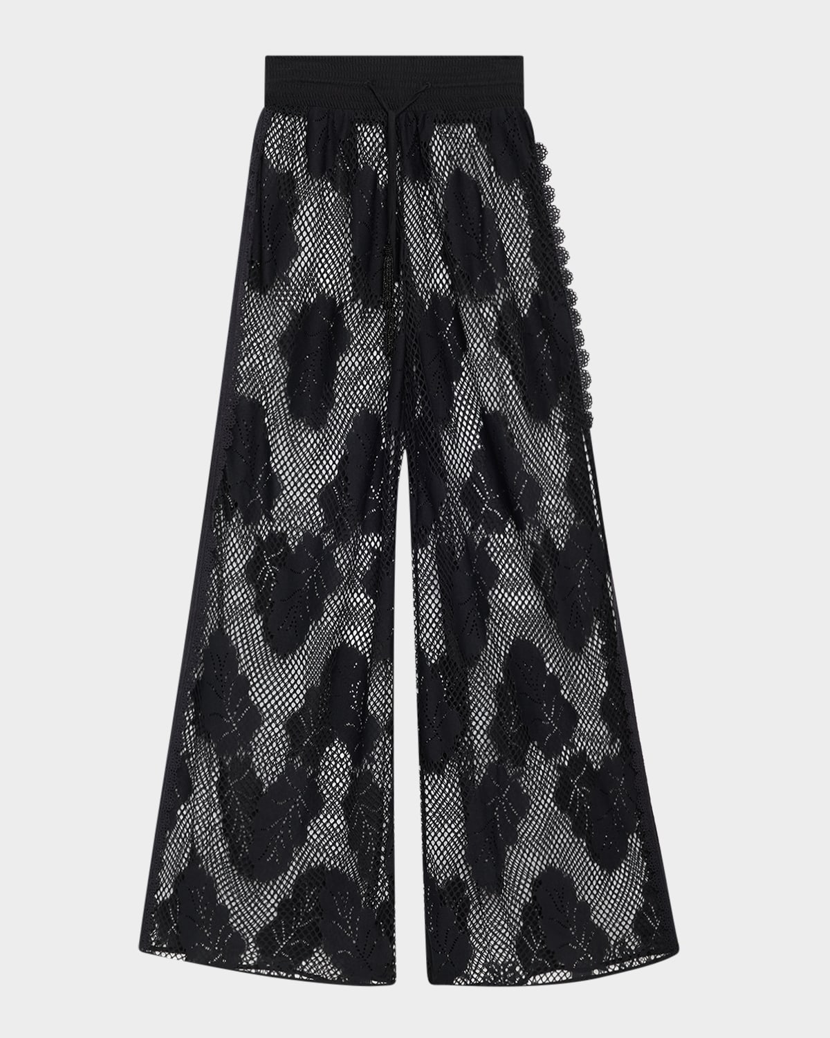Ramy Brook "Luana" sheer openknit pants with tonal leaf embroidery Highrise drawstring waistband Full length Relaxed legs Pullon style Nylon/polyamide Machine wash cold, tumble dry Imported
